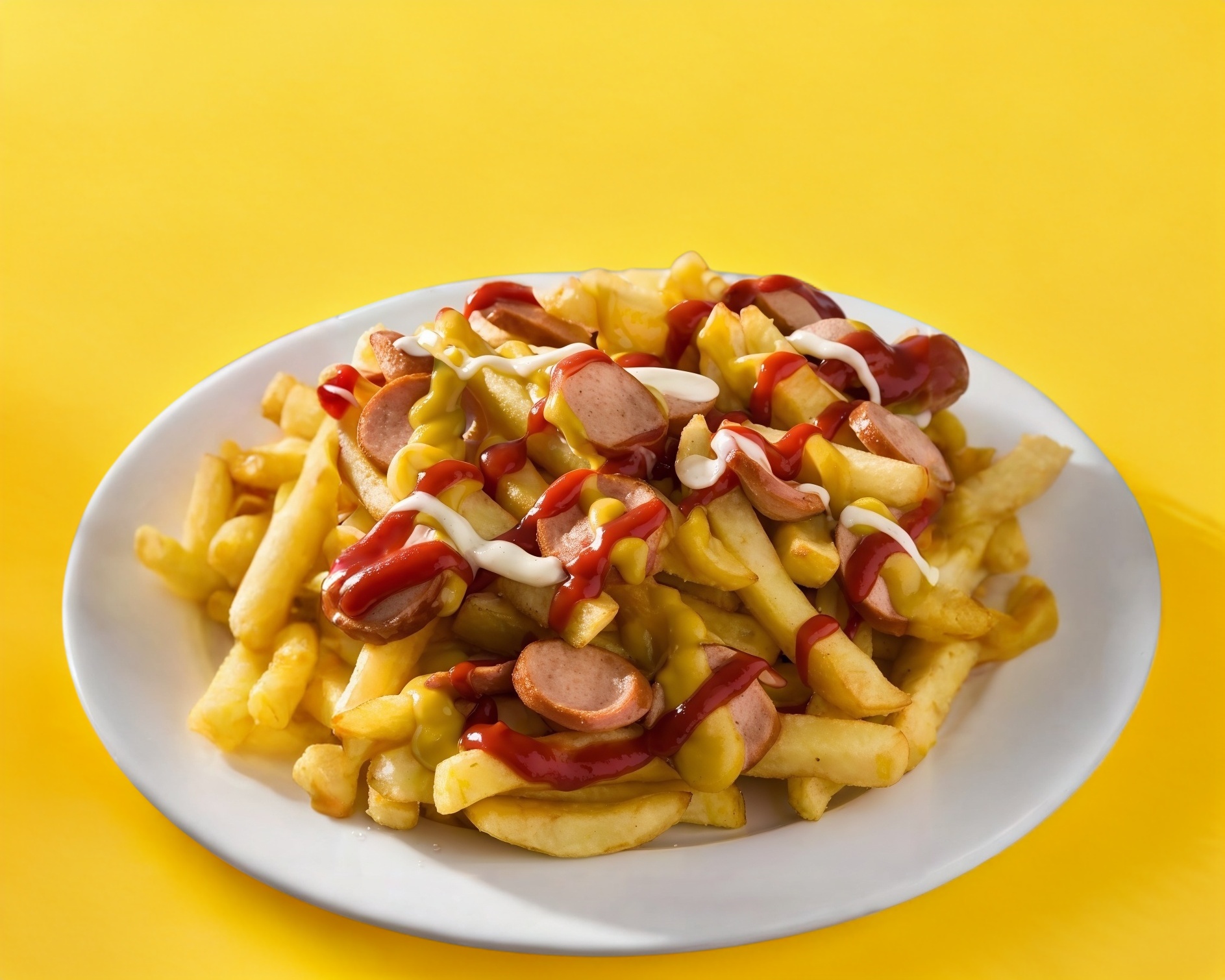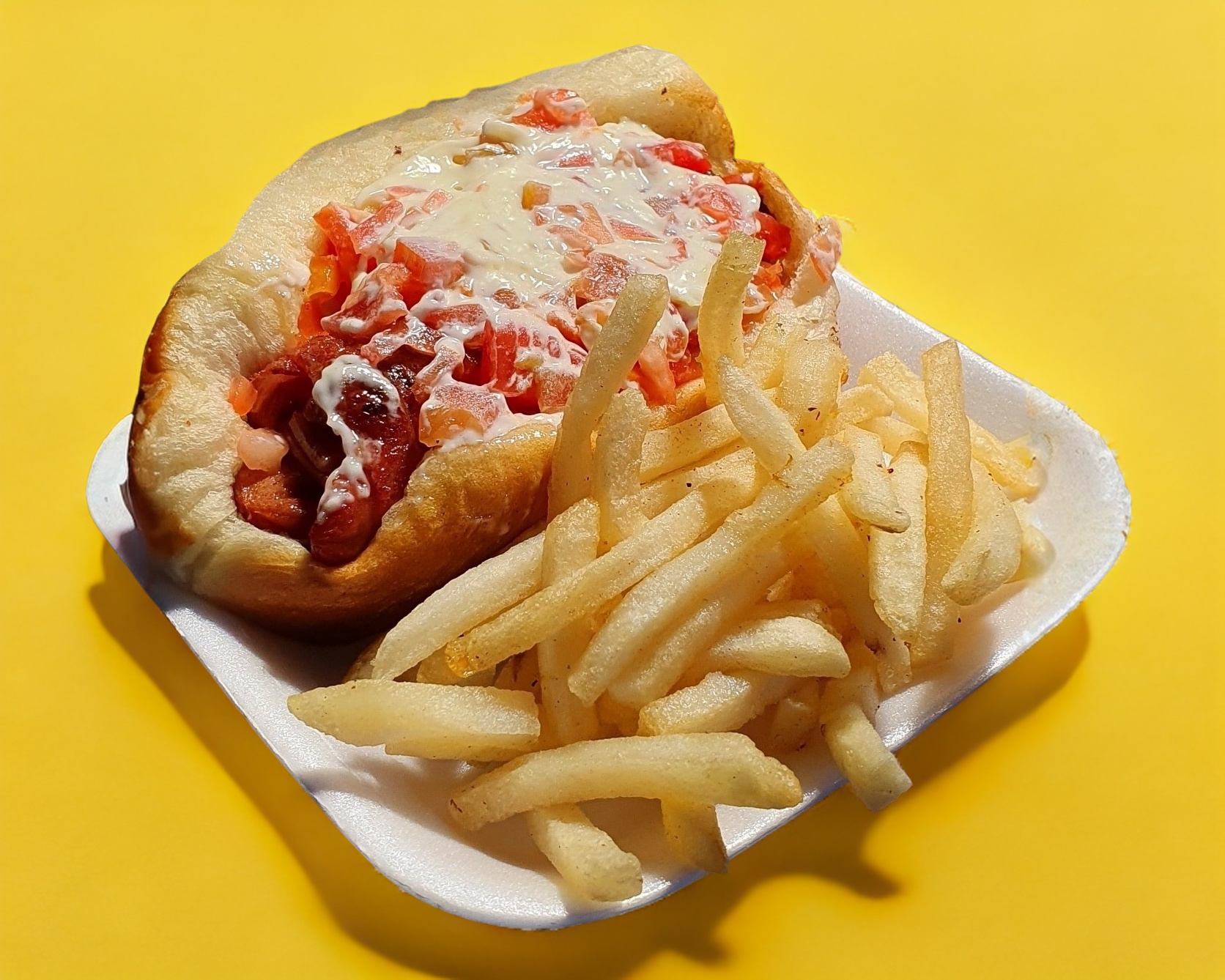 Papas con una salchicha acompañada de mayonesa.