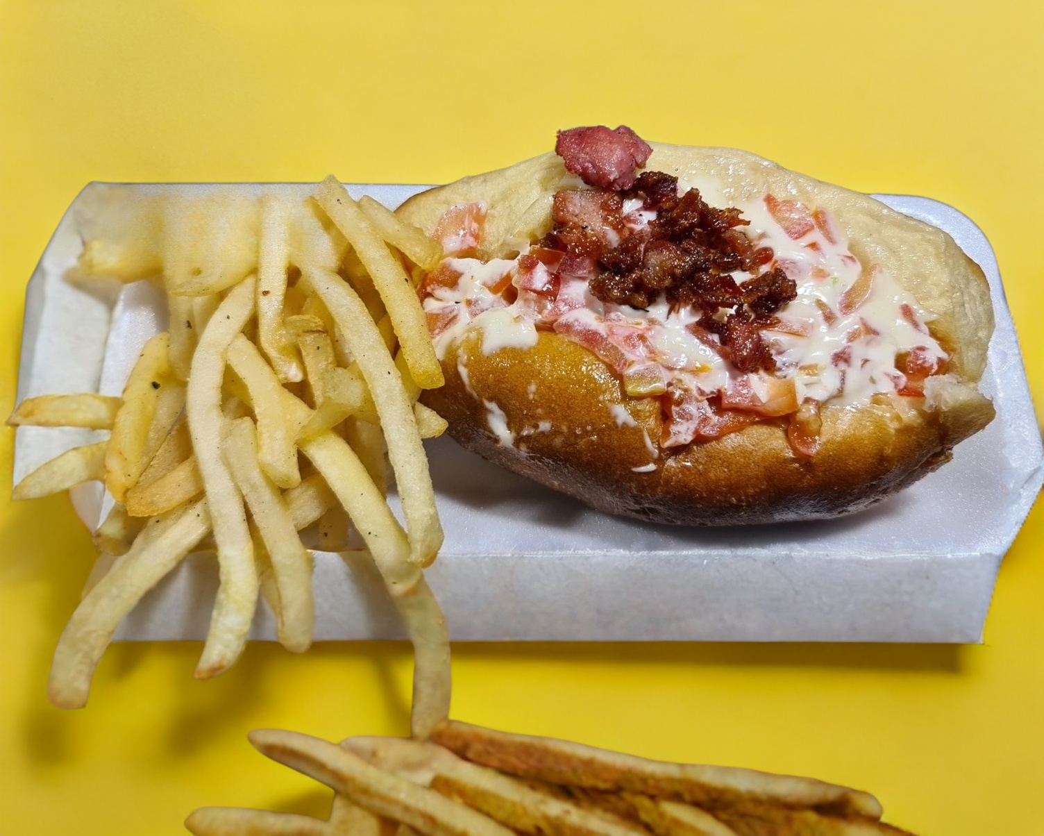 Hot dog en pan normal con wini rosarito y tocino, tomate, cebolla asada o cruda, mayonesa, huichol, mostaza, incluye papas.