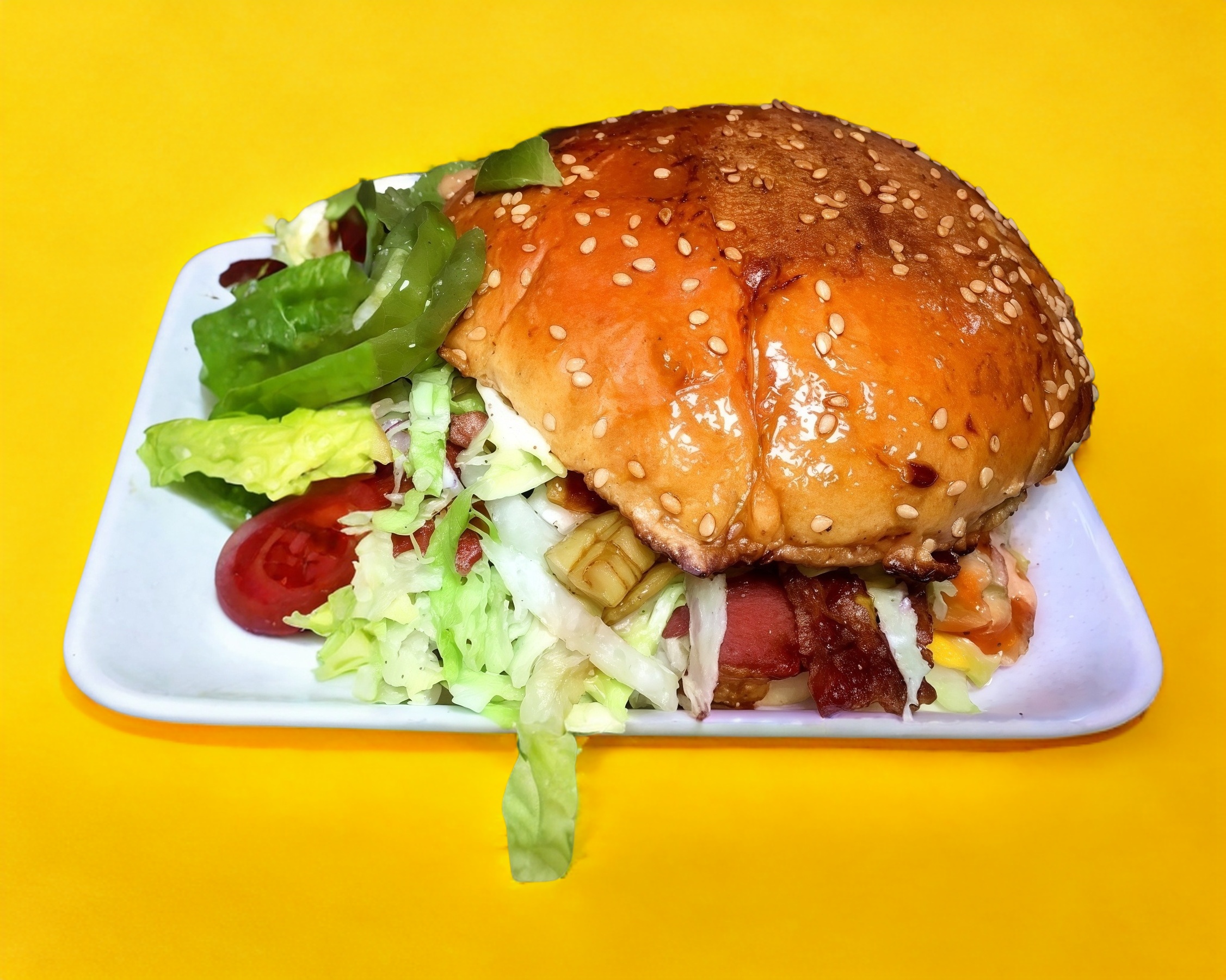 Hamburguesa con doble queso, 1 carne de res, jamón, cebolla asada, tocino, lechuga, tomate, incluye papas.