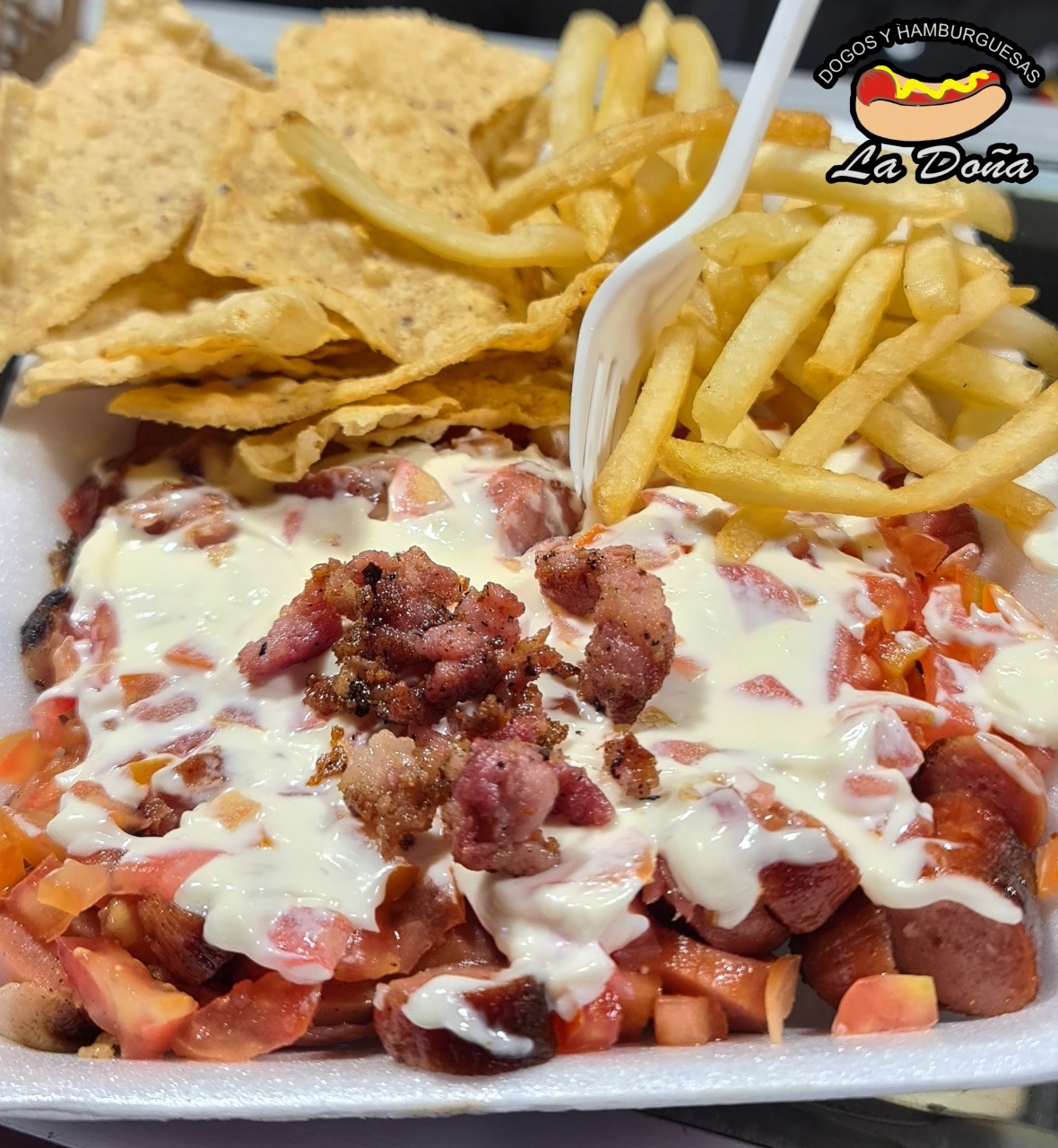 3 Salchichas 35gr rosaritos , cebolla, tomate, mayonesa, totopos y tocino 10gr.