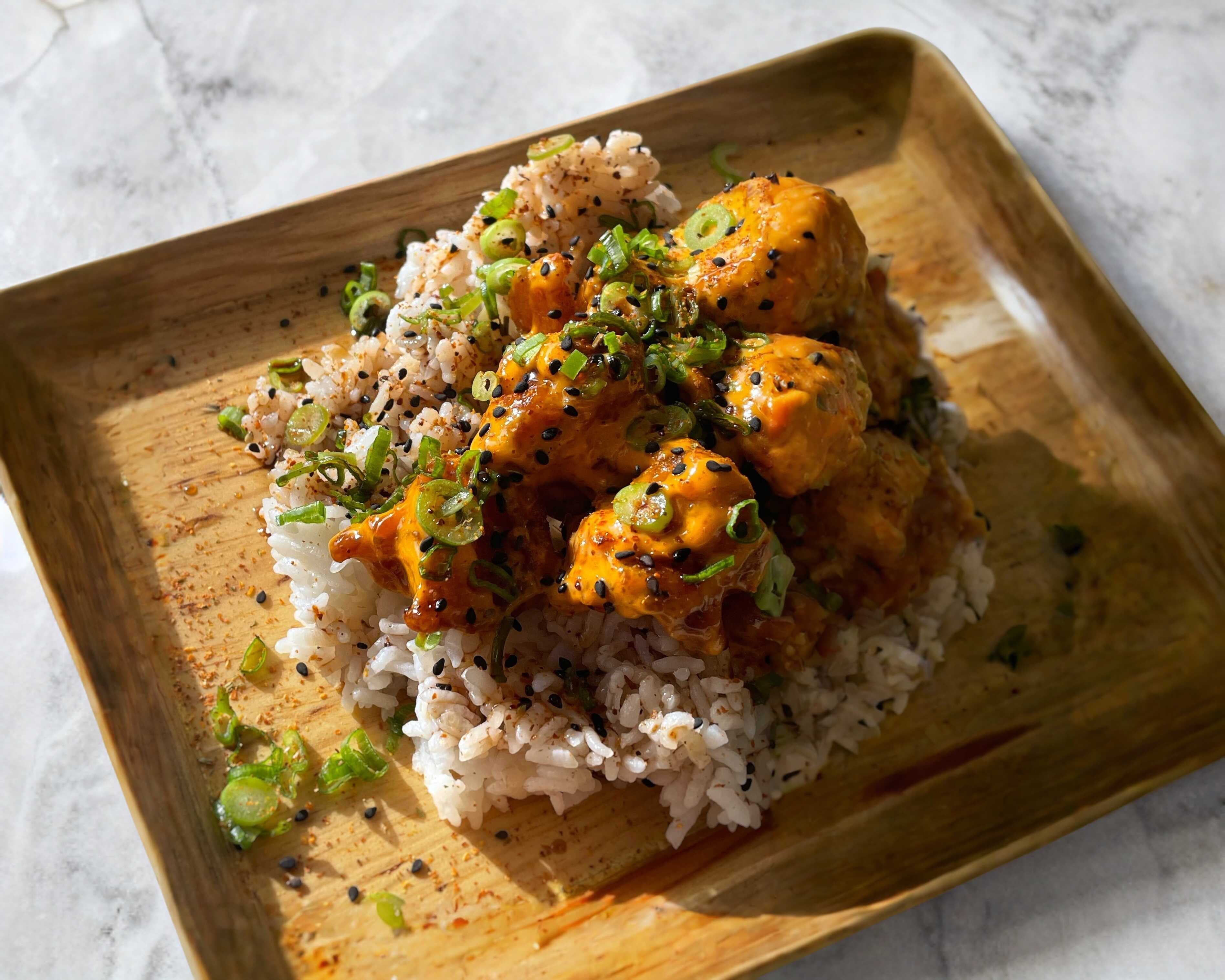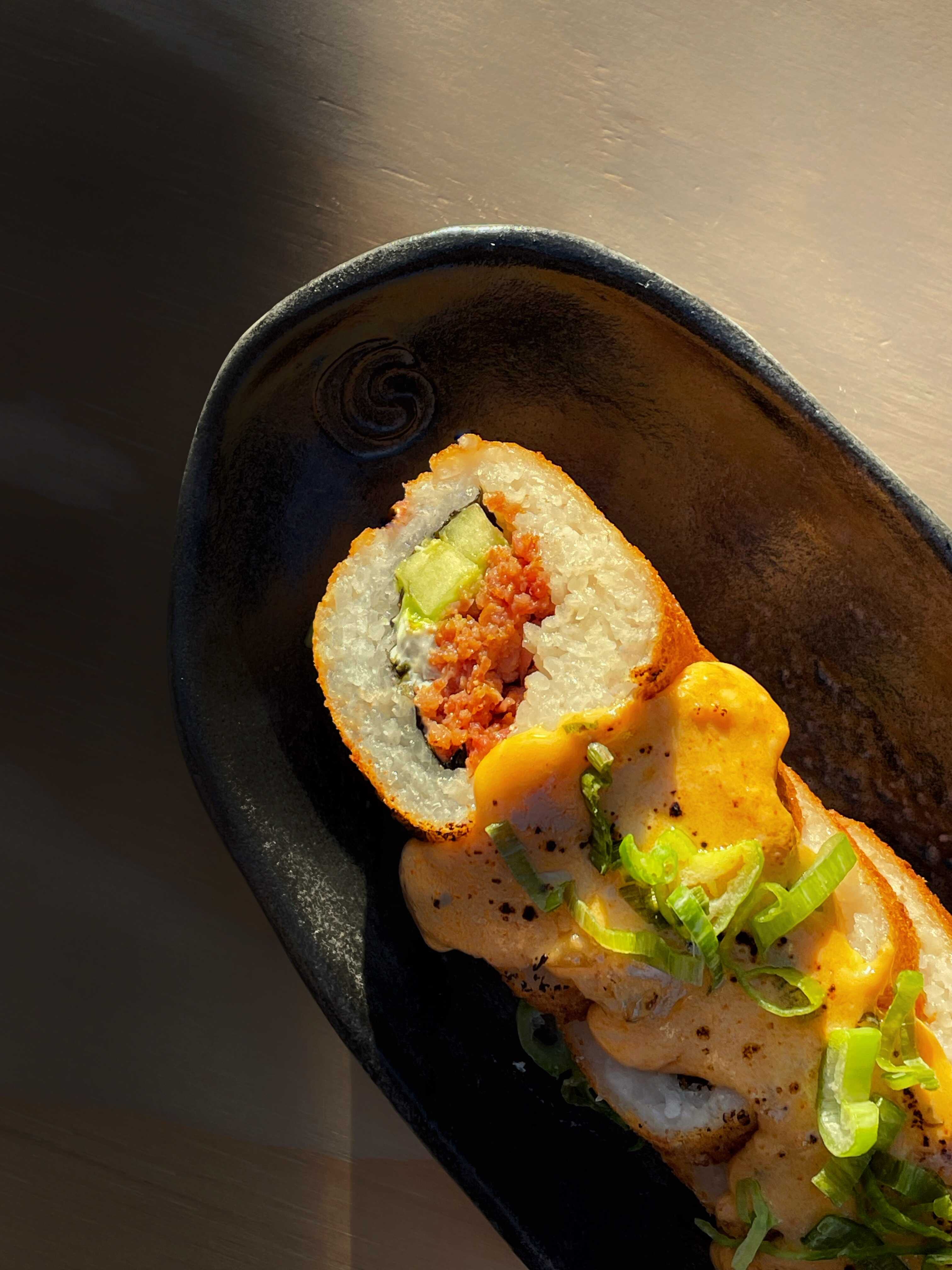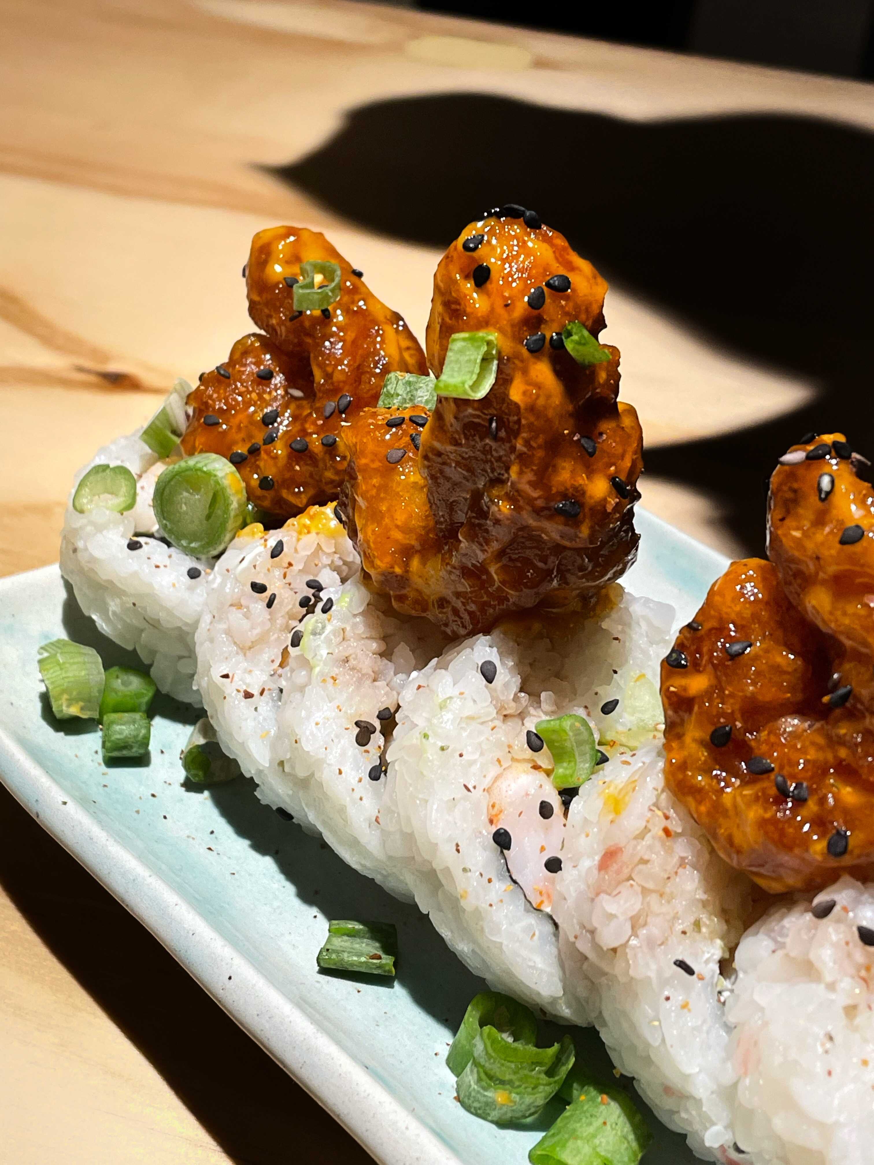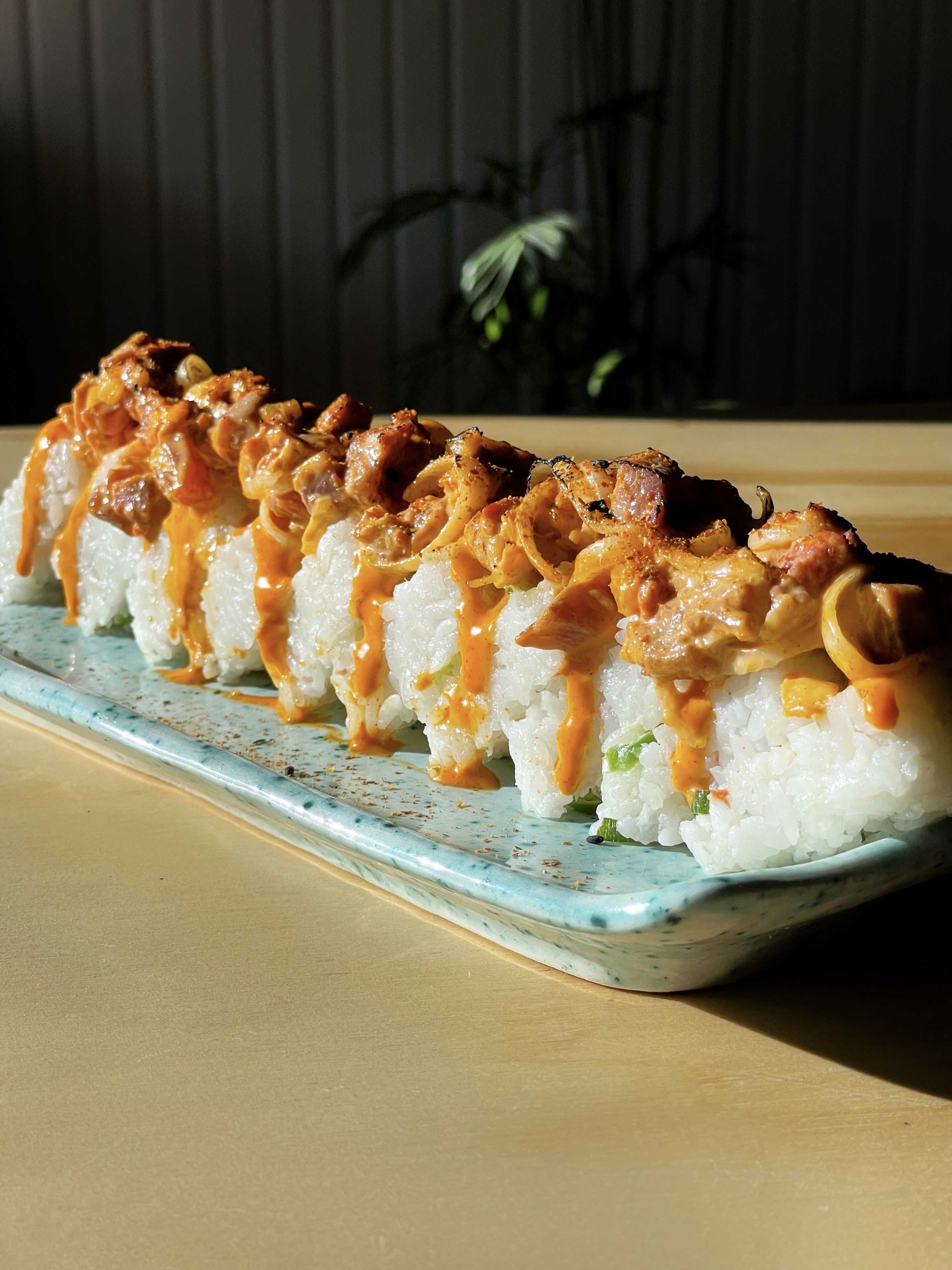 Camarón, spicy mayo, arroz gohan, cebollita, ajonjolí, togarashi, ponzu.
