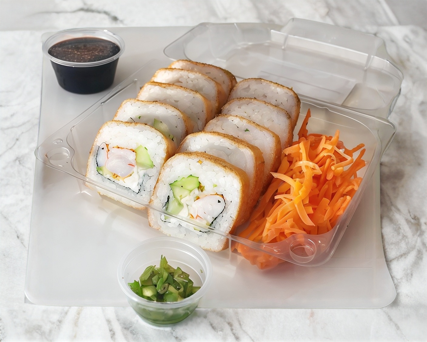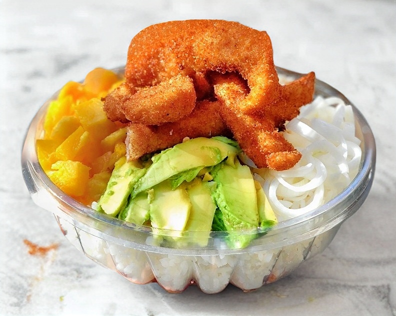 Arroz gohan, boneless, pepino, mango, cebolla, aguacate y ajonjolí.