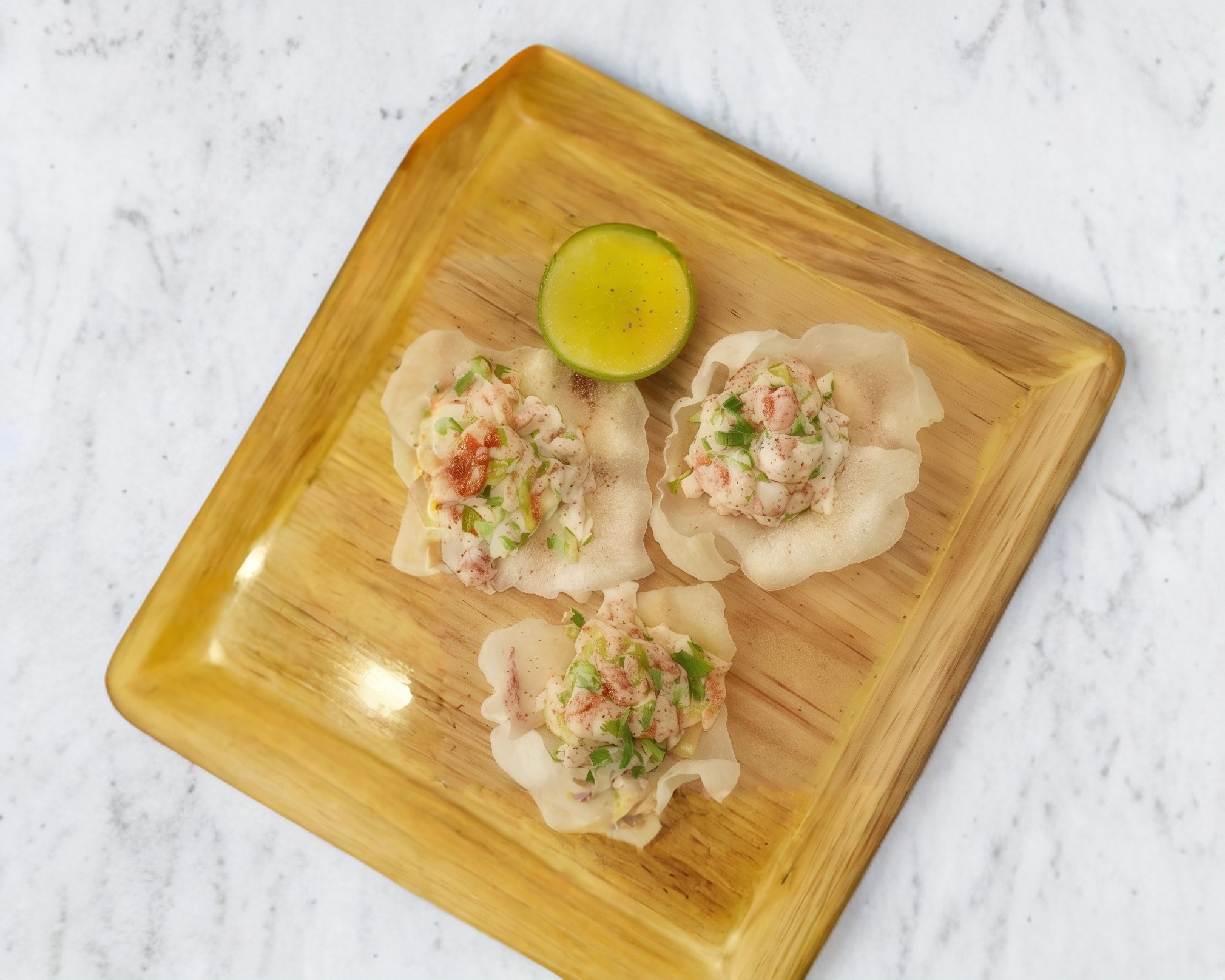 Kanikama, chile serrano, cebollín, mayo, tortilla de harina, spicy mayo.