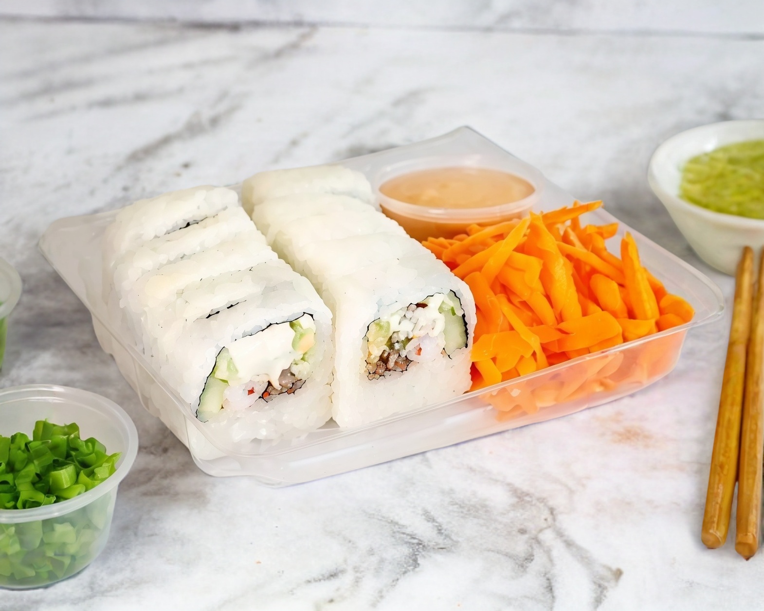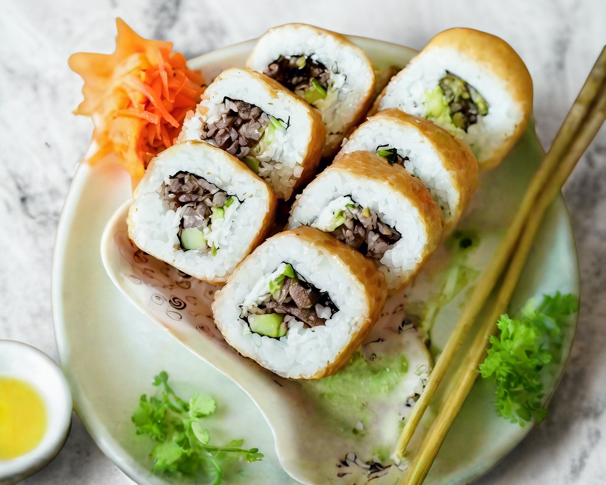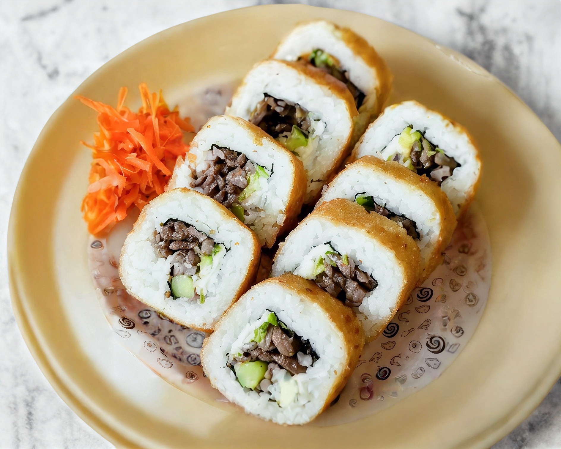 1 Rollo de sushi (10 Bocados) con carne asada, queso crema, pepino y aguacate.