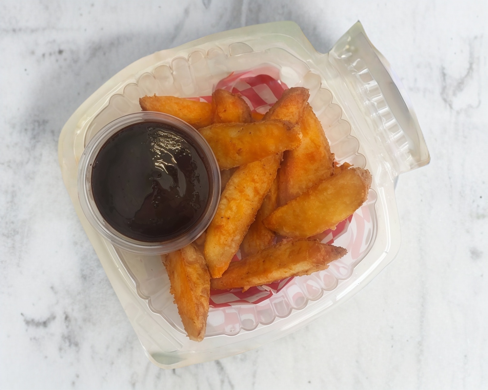 Gajos de papas sazonadas acompañadas de cátsup.