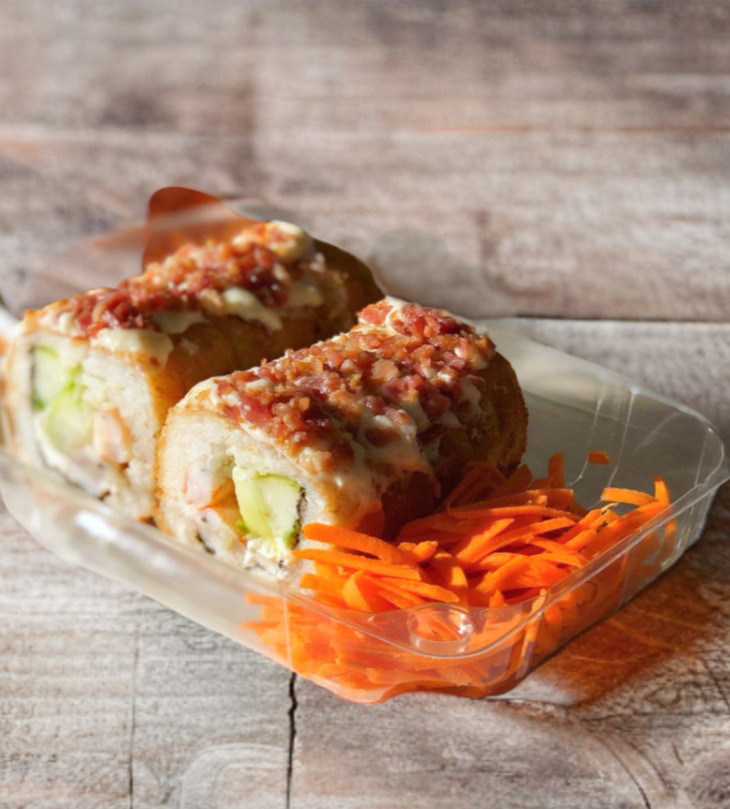 Camarón, queso crema, pepino, aguacate, encima queso gratinado y tocino.