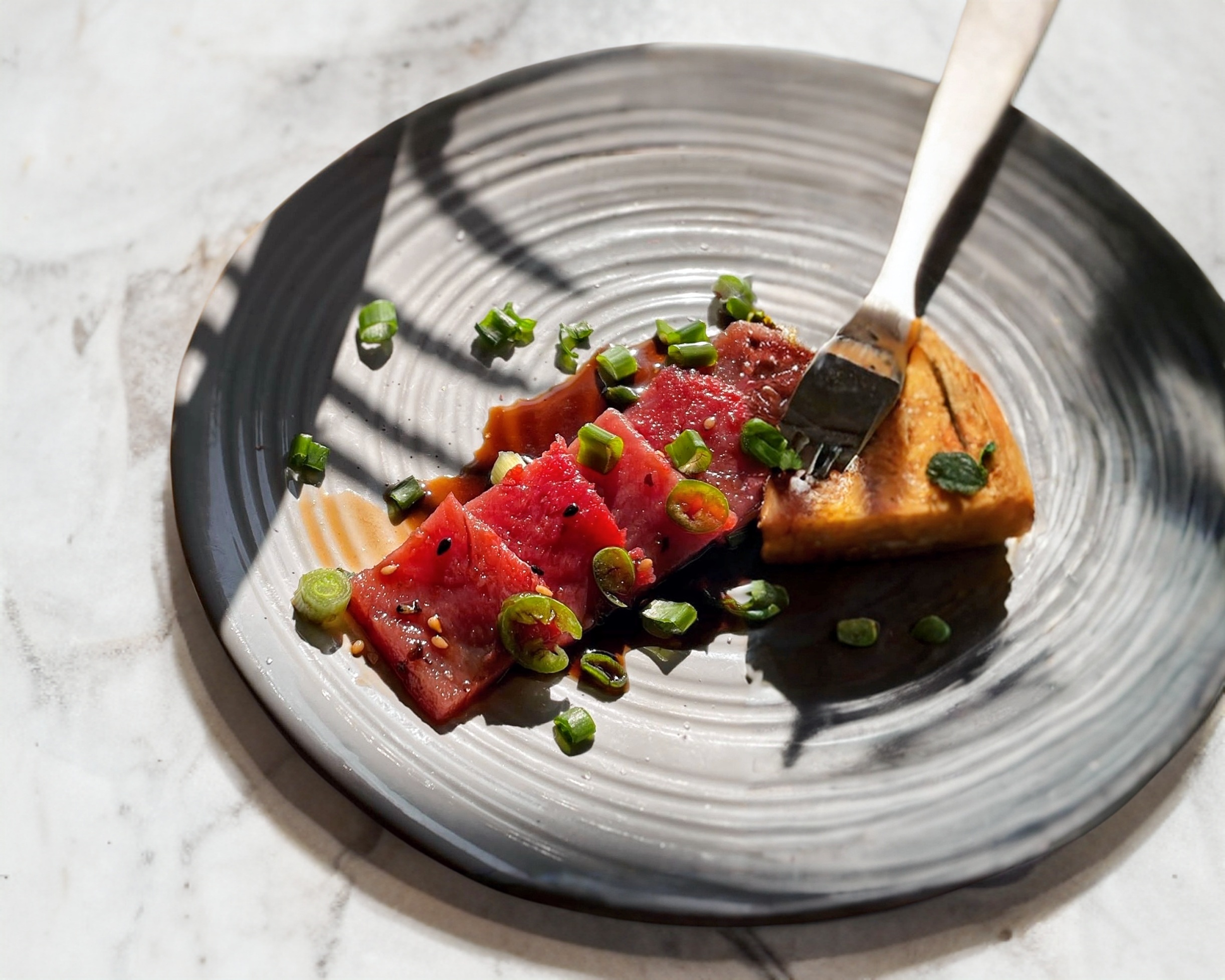 Atún, ponzu, serrano, cebollín.