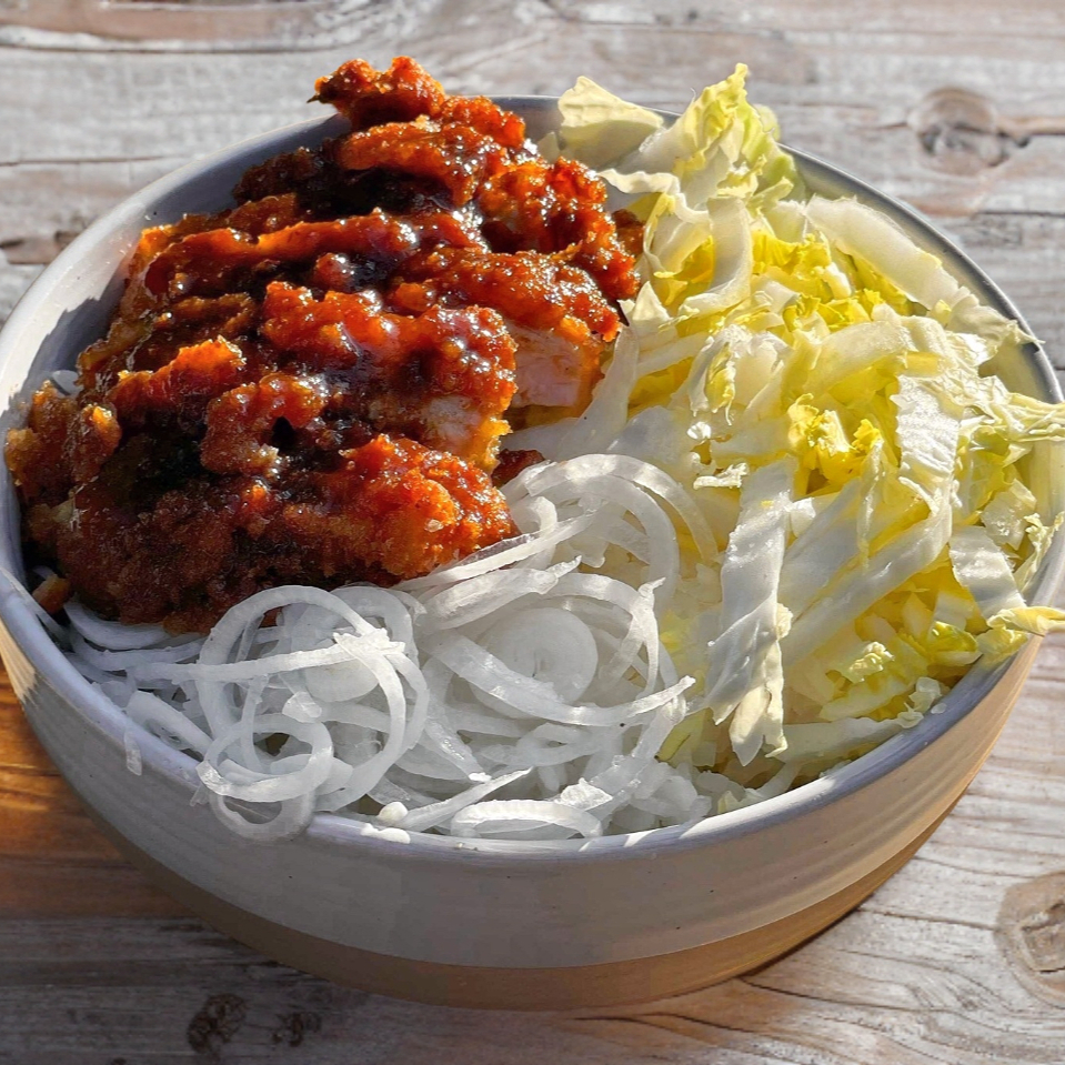 Lomo de cerdo empanizado, salsa tonkatsu, napa, cebollín, arroz gohan.