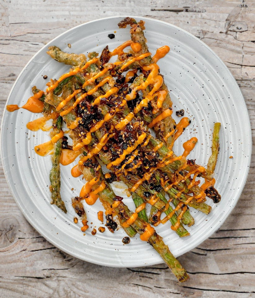 Espárrago, spicy mayo, salsa macha.