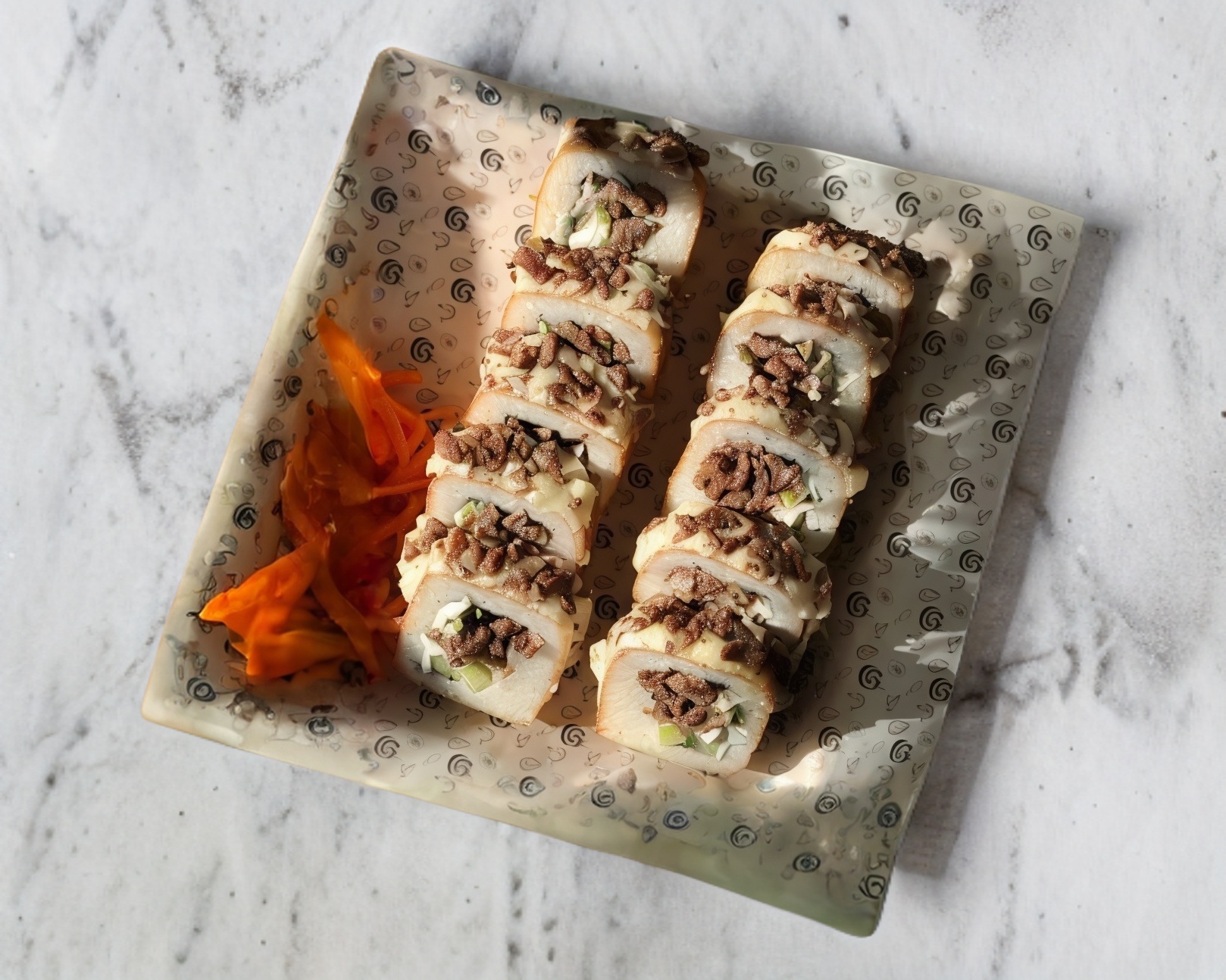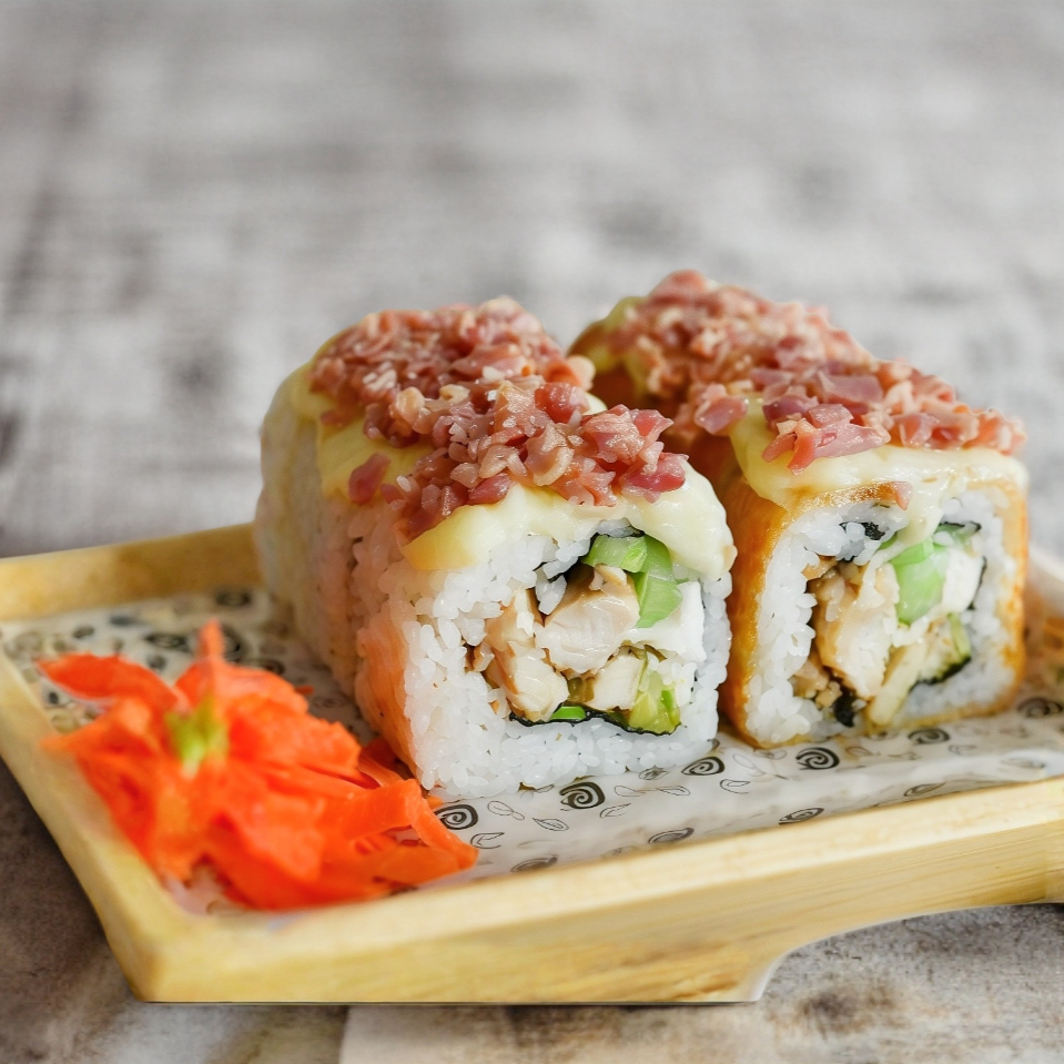 Pollo, queso crema, pepino, aguacate, encima queso crema, tocino y salsa de jalapeño.