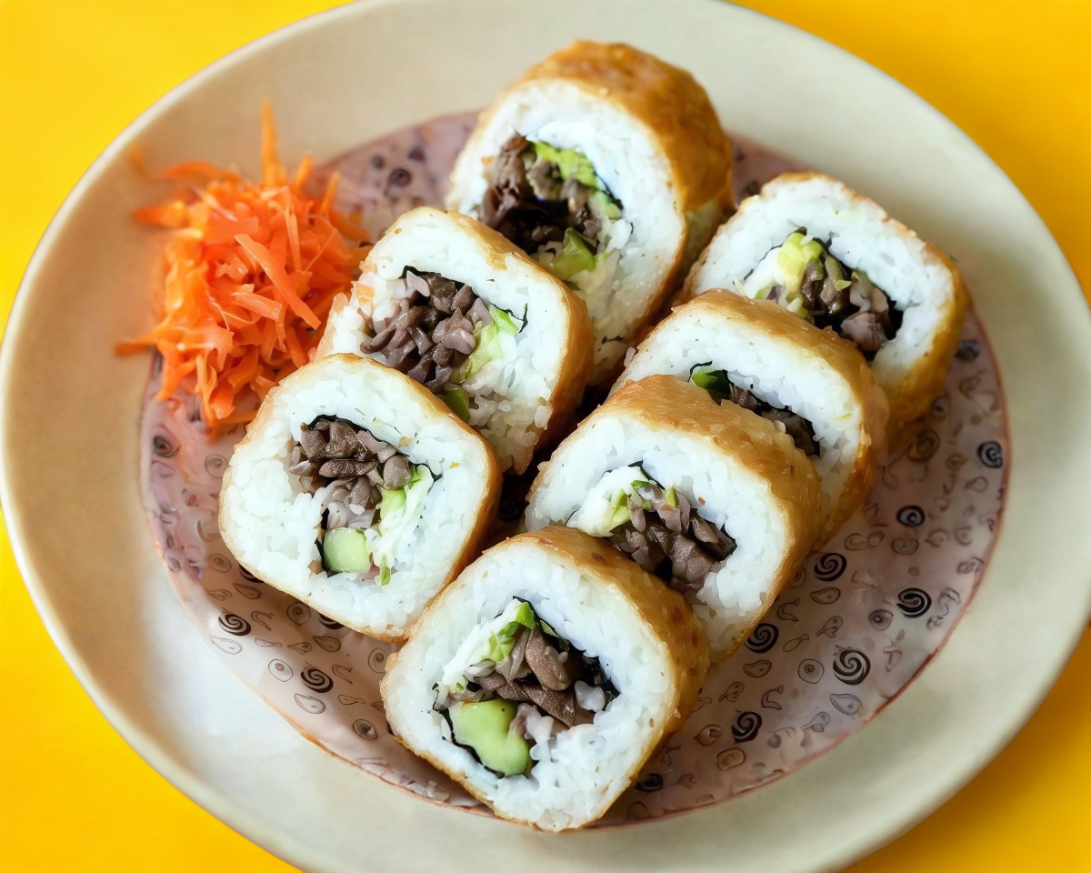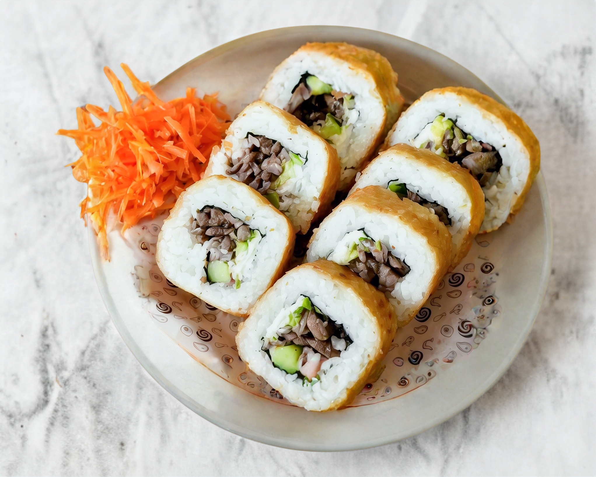 Pollo, carne asada y camarón, queso crema, pepino y aguacate.