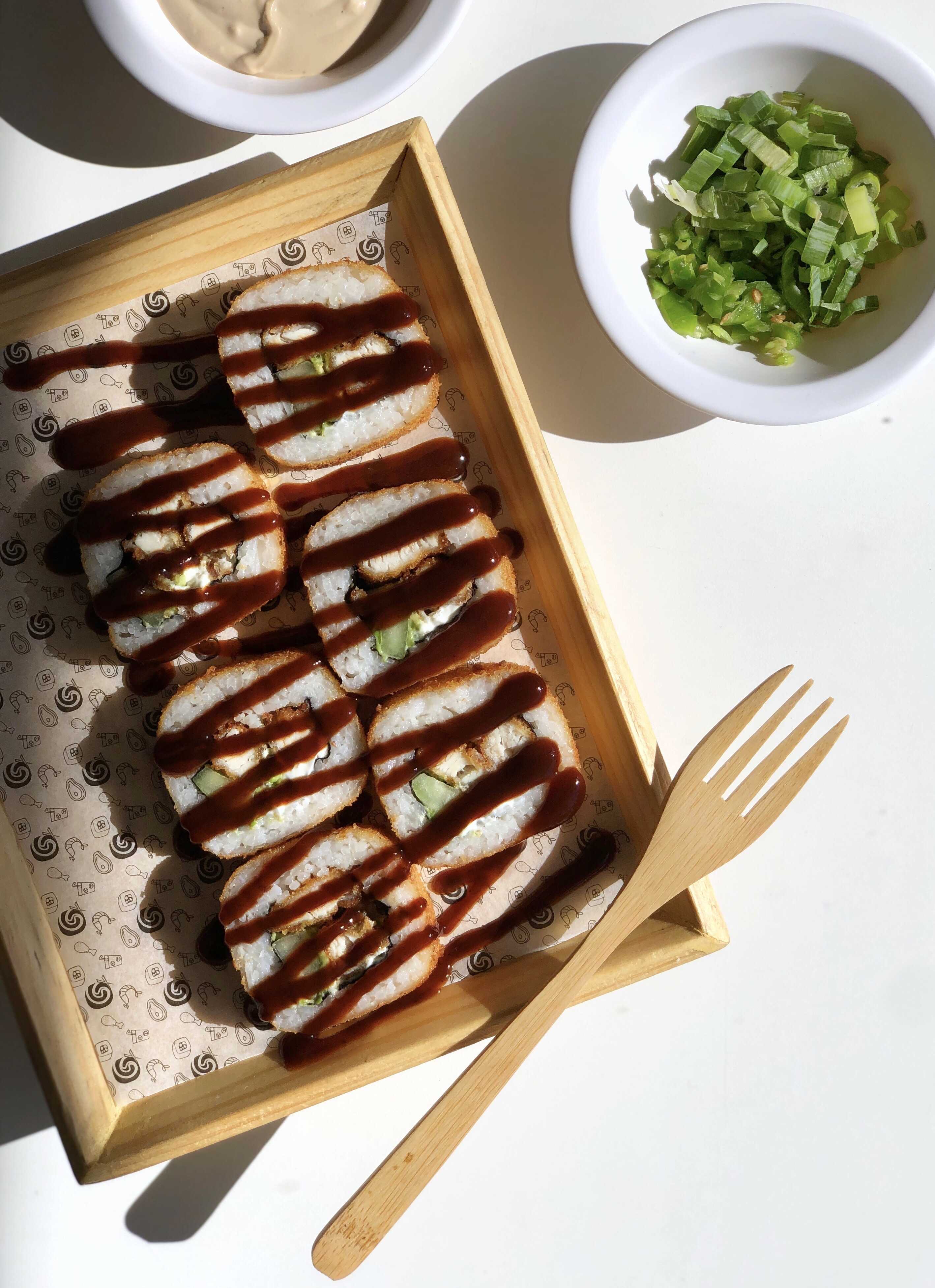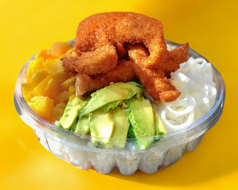 Arroz gohan, boneless, pepino, mango, cebolla, aguacate y ajonjolí.