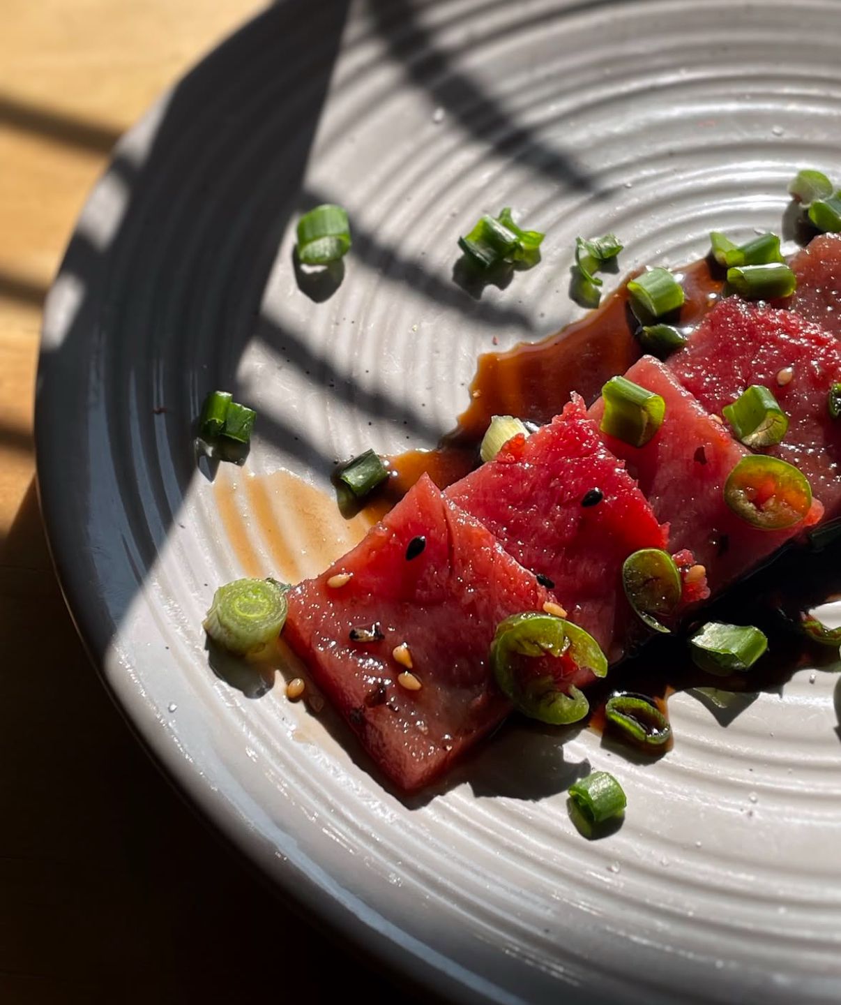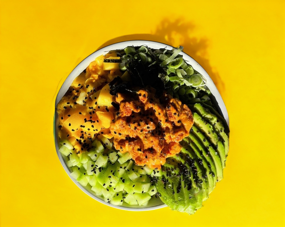 Arroz gohan, atún, salsa spicy, tallo de cilantro, cebollín, aguacate, alga nori, mango, pepino, togarashi.
