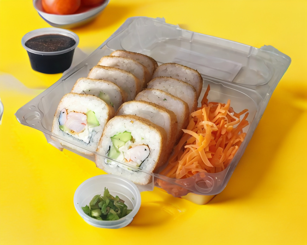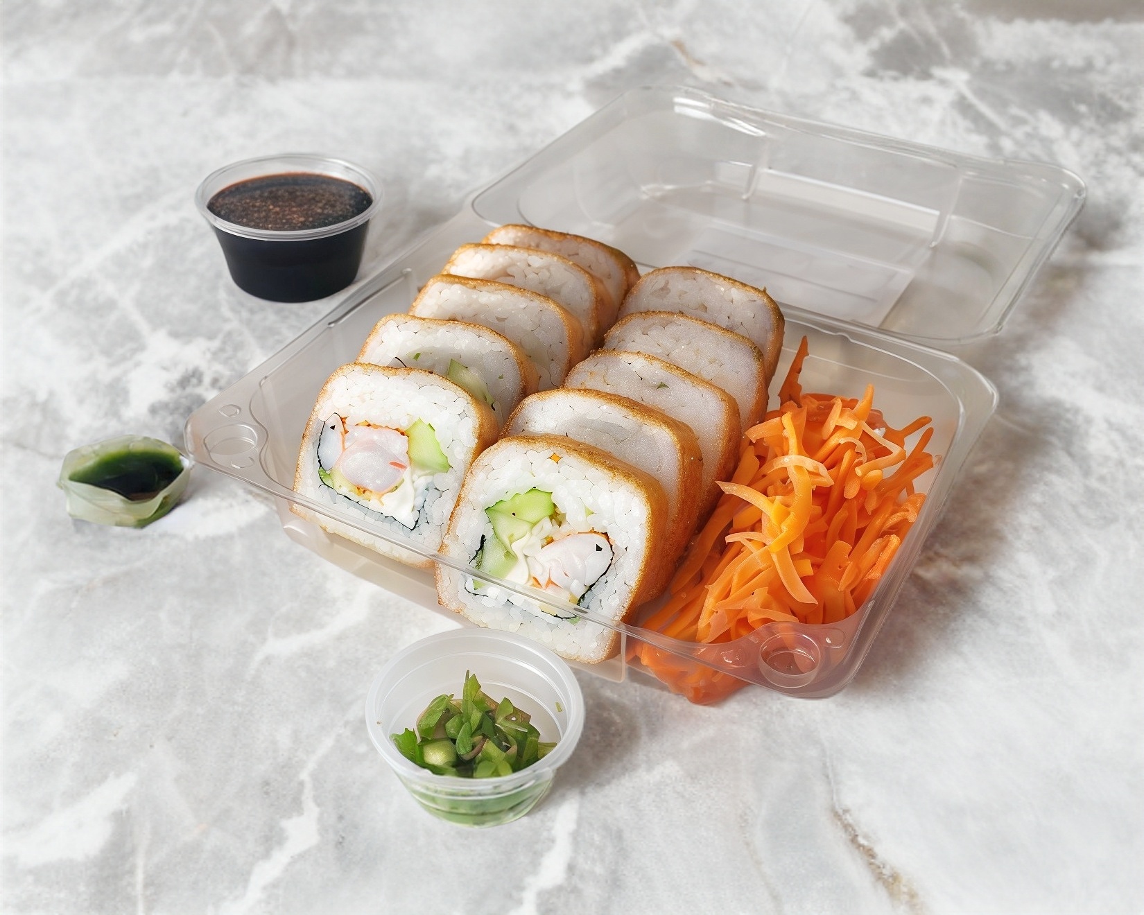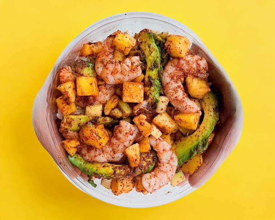Arroz gohan, camarón, pepino, mango, aguacate y chile en polvo.