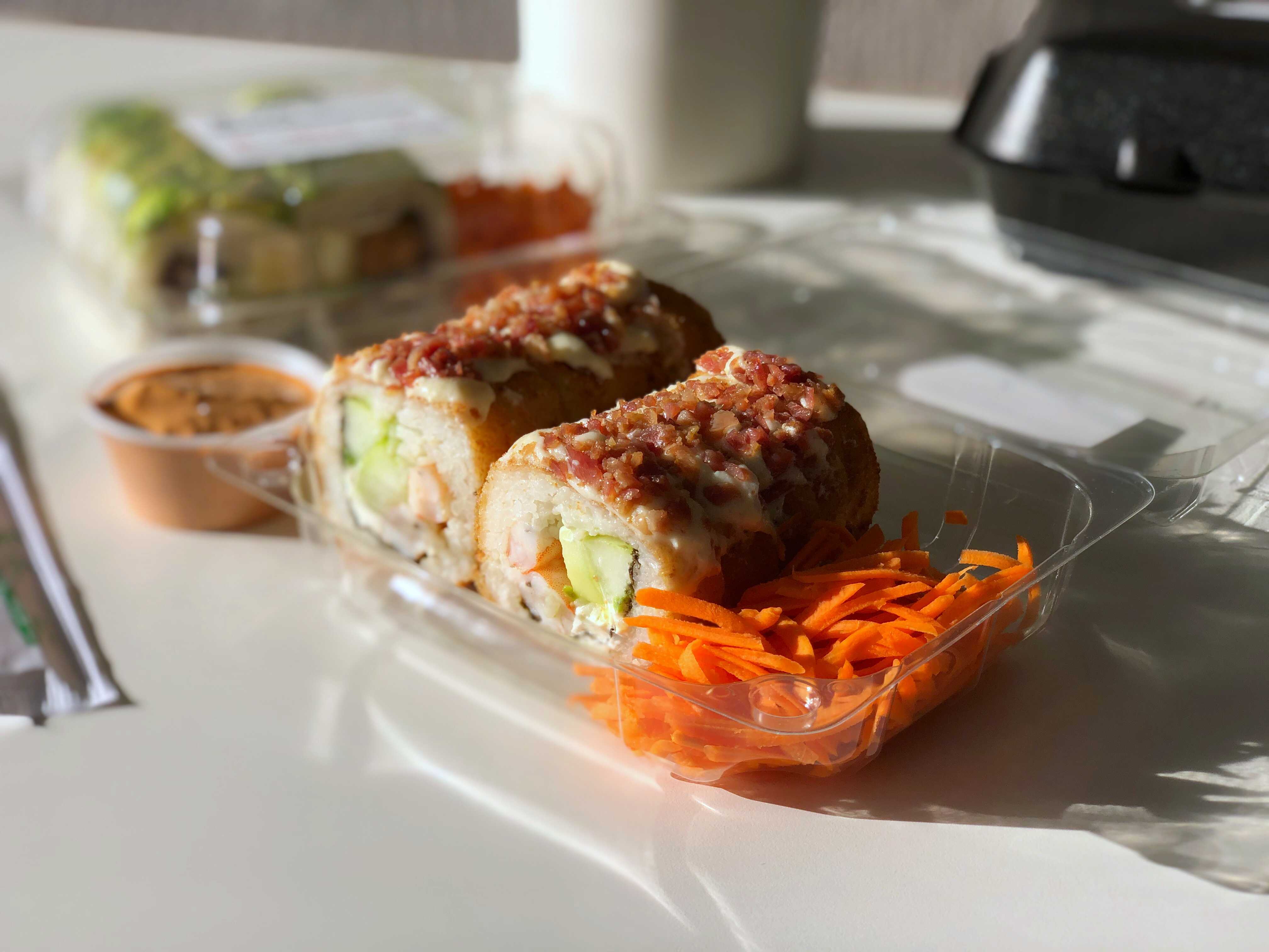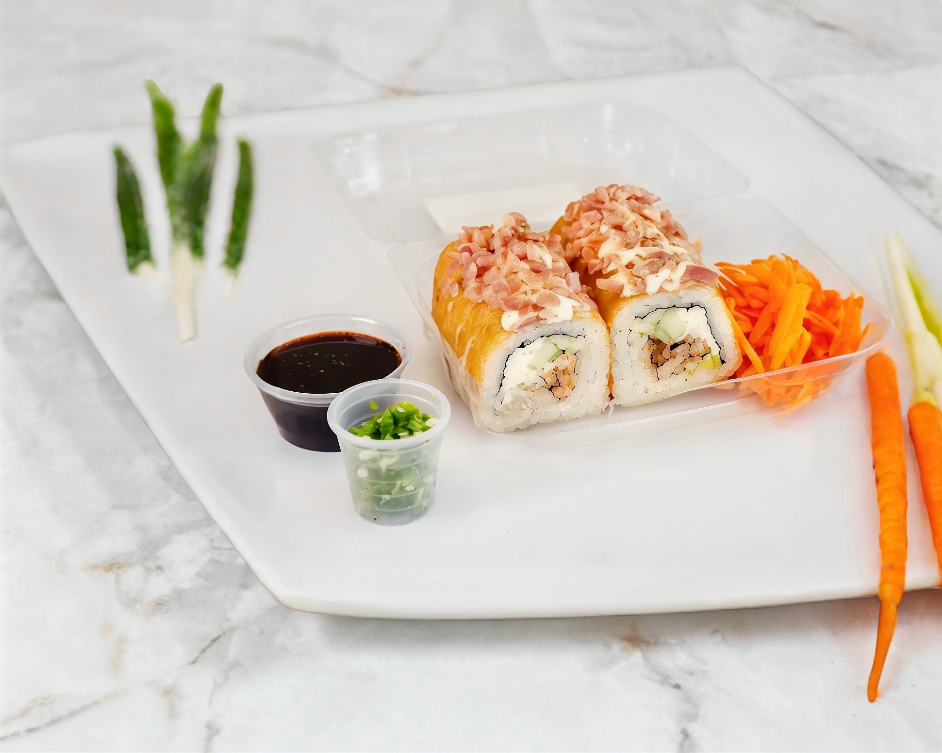 Camarón, spicy mayo, arroz gohan, cebollita, ajonjolí, togarashi, ponzu.