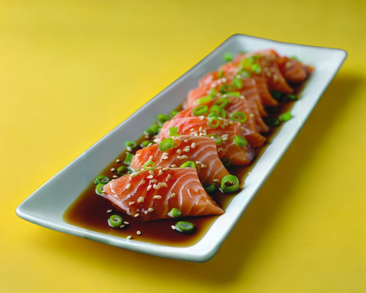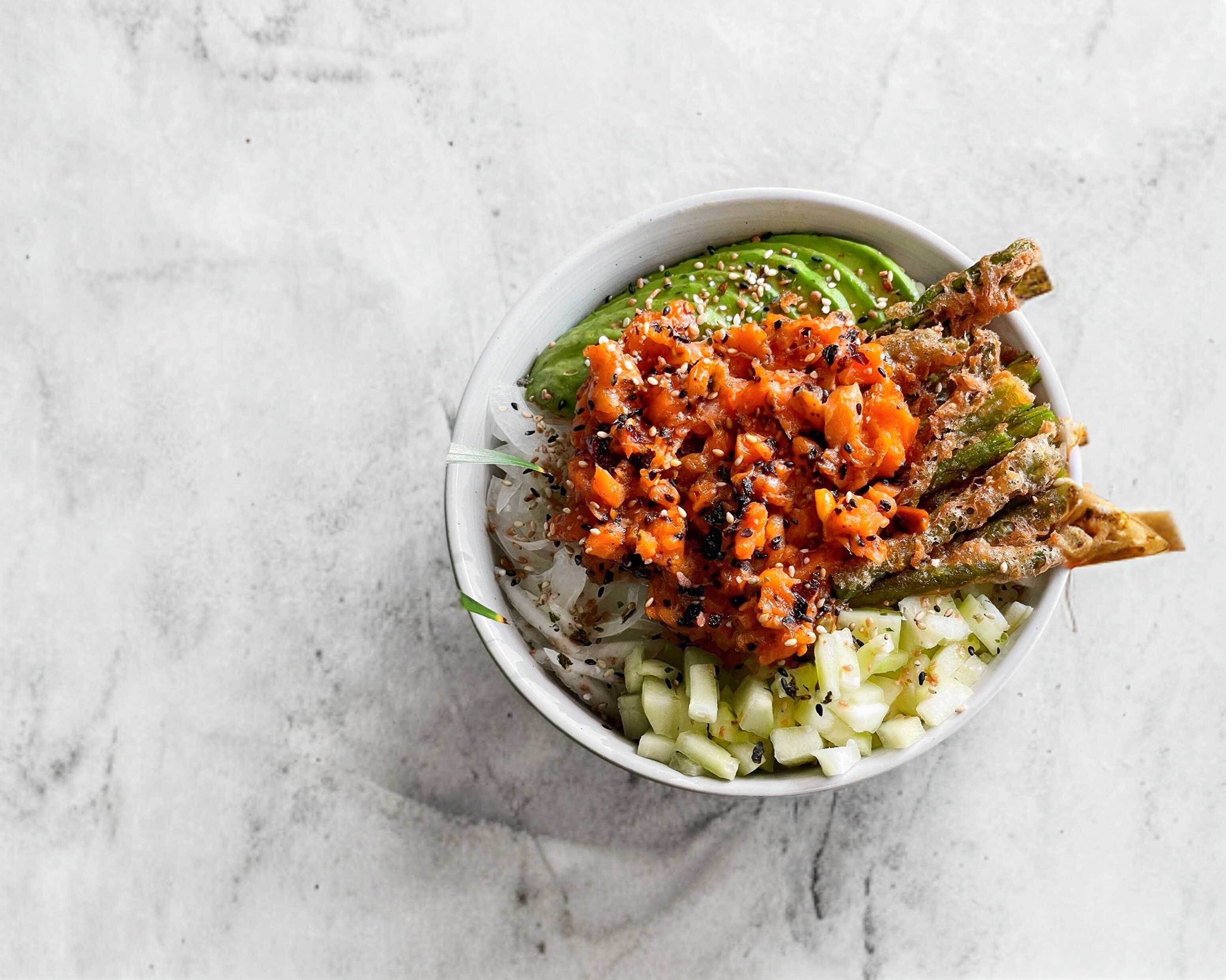 Arroz gohan, salmón, salsa macha, espárrago en tempura, aguacate, furikake, pepino, cebolla.