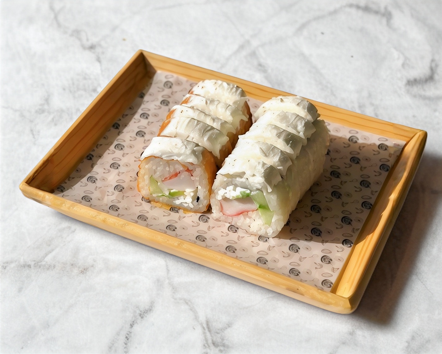 Camarón, queso crema, pepino, aguacate, encima queso gratinado y tocino.