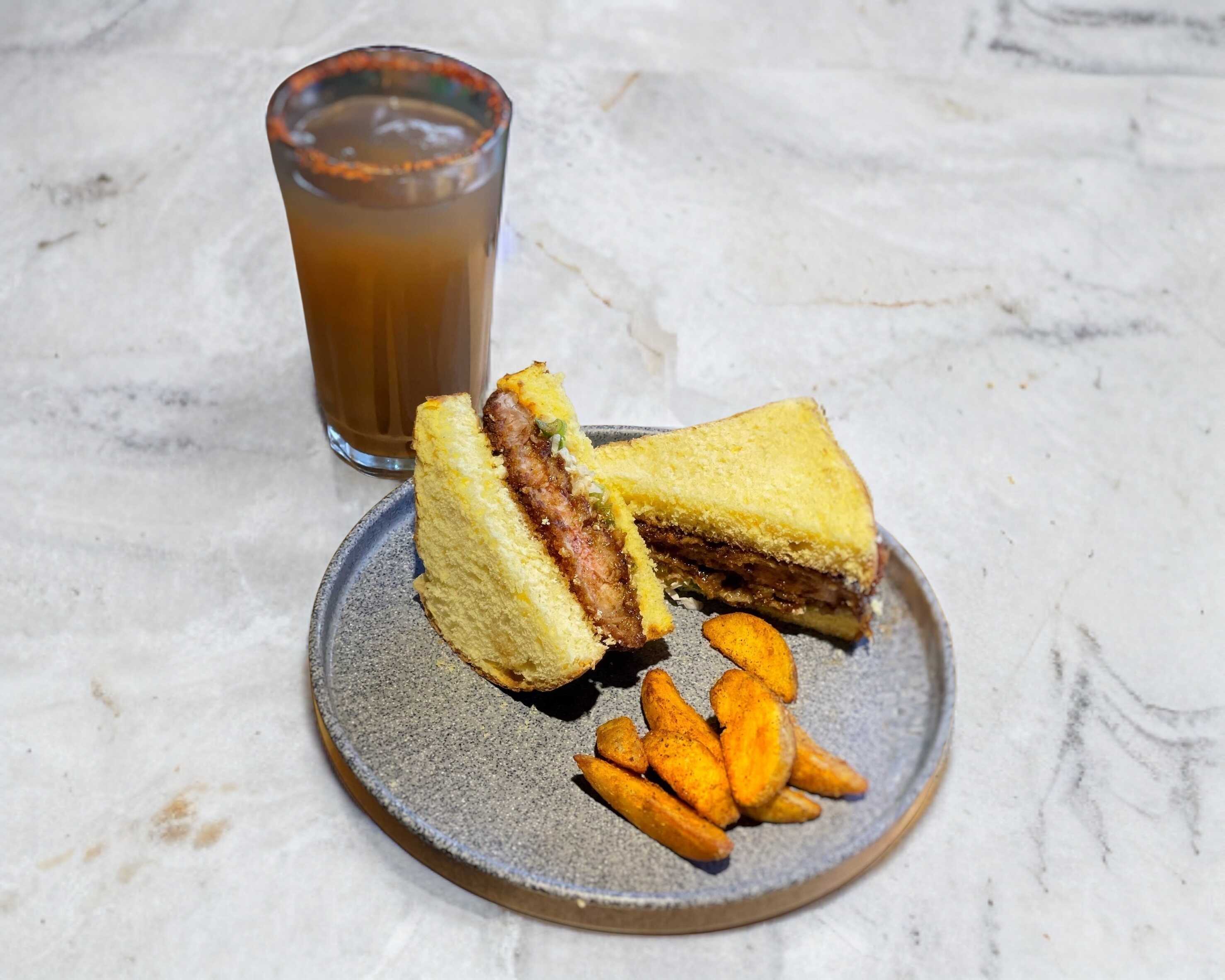 Pan brioche, lomo de cerdo empanizado, salsa tonkatsu, napa, cebollín, papas.