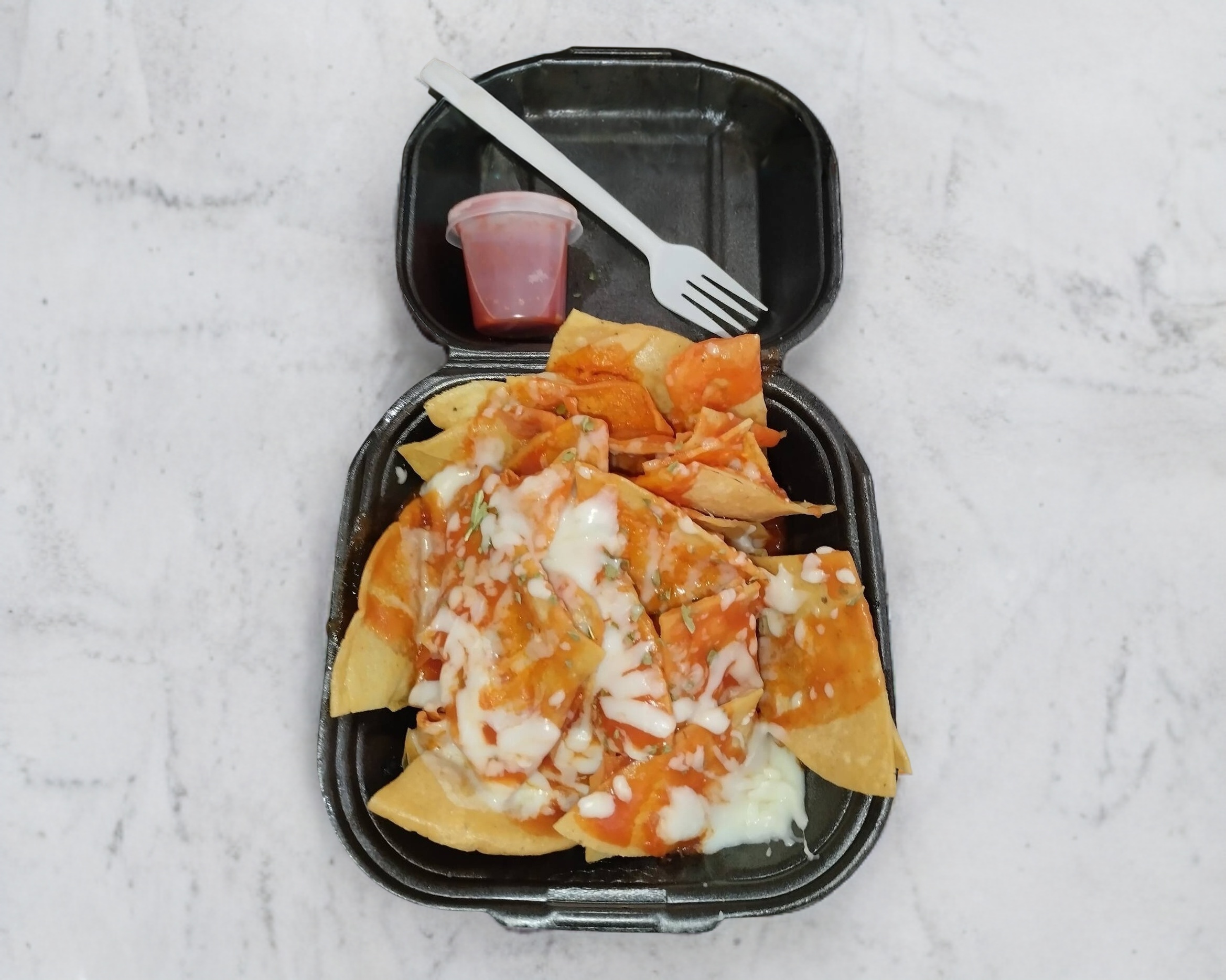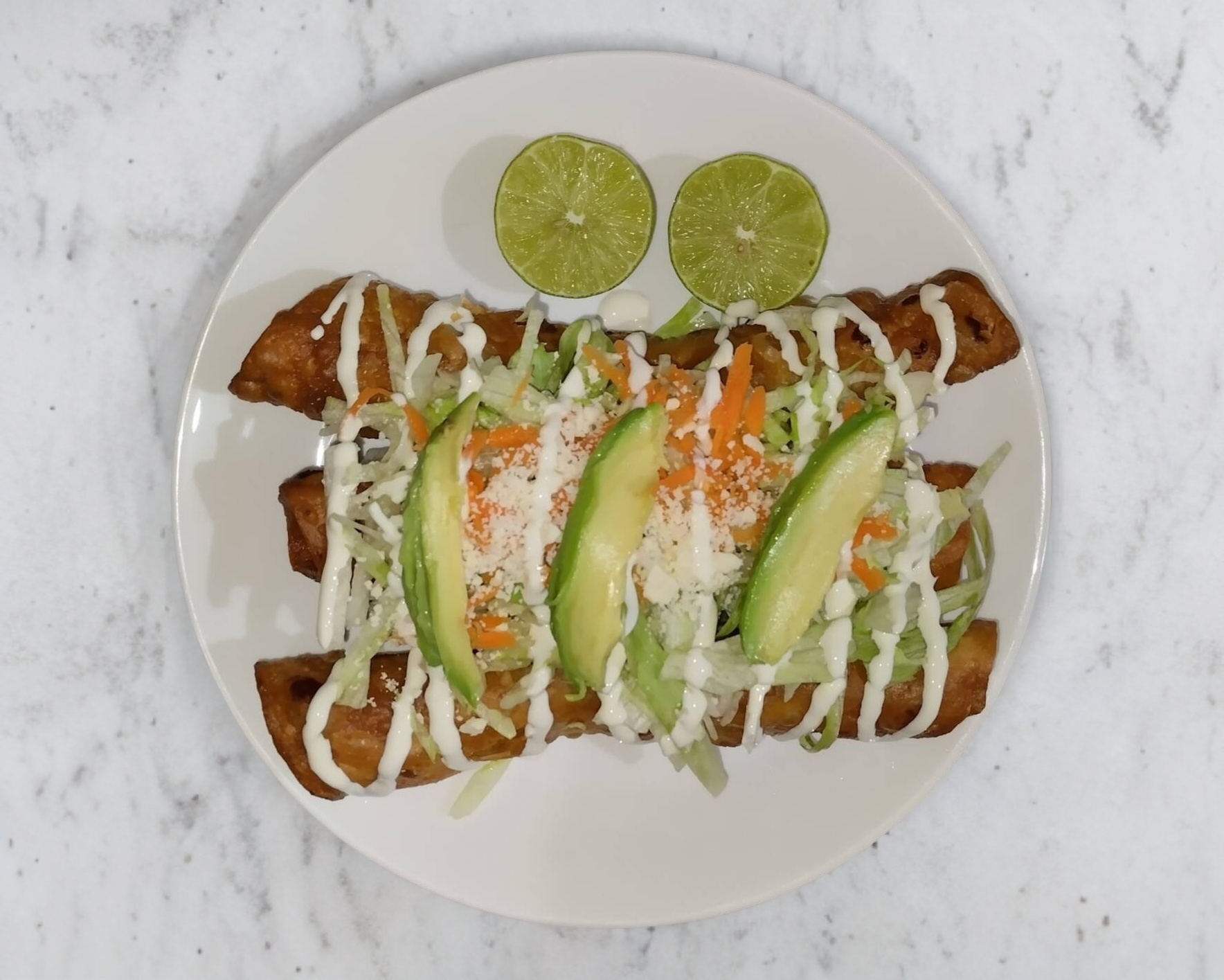 Chimichanga con lechuga, zanahoria, aguacate, quesito molido y media crema.