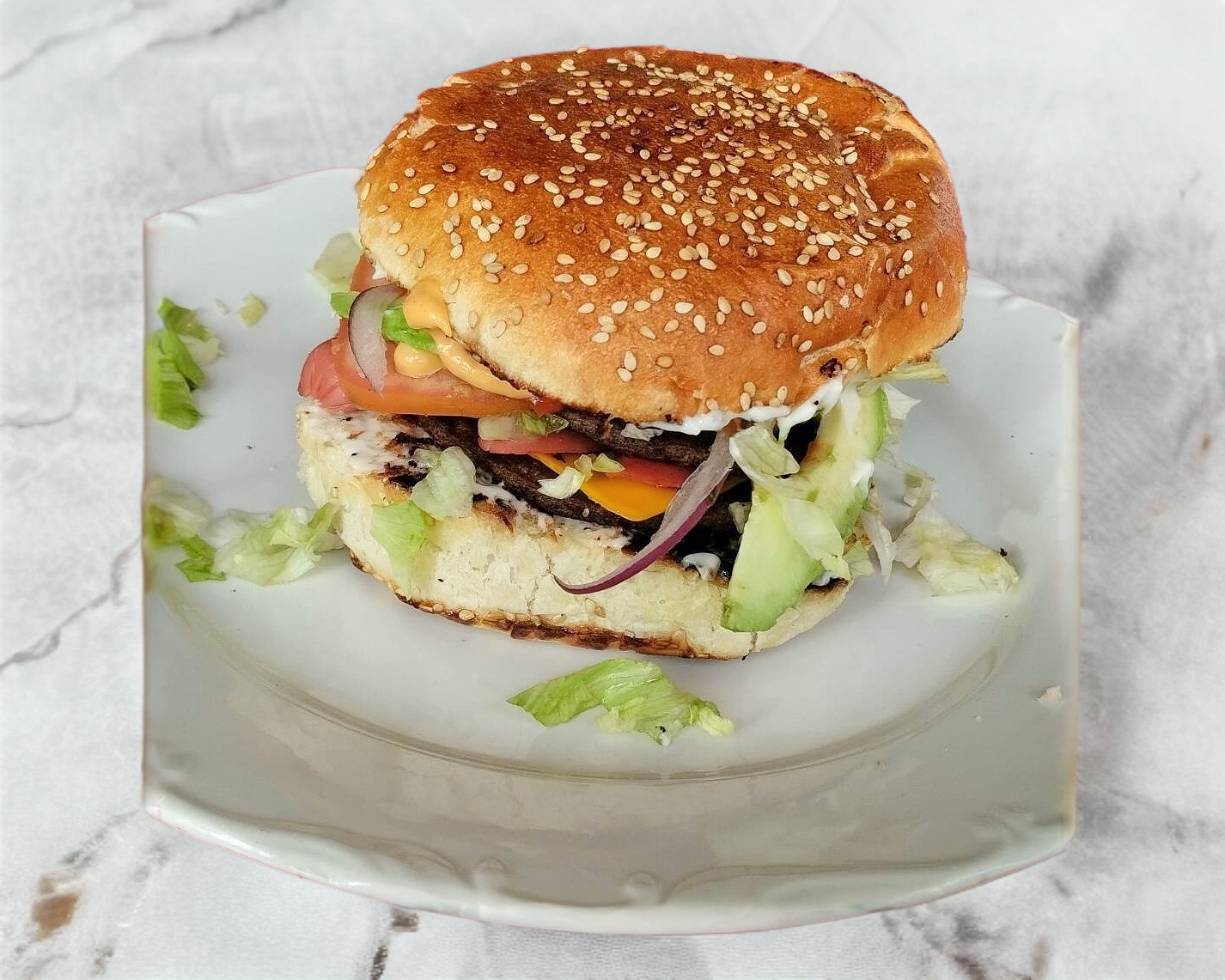 Hamburguesa clasica con lechuga, tomate, aguacate y cebolla