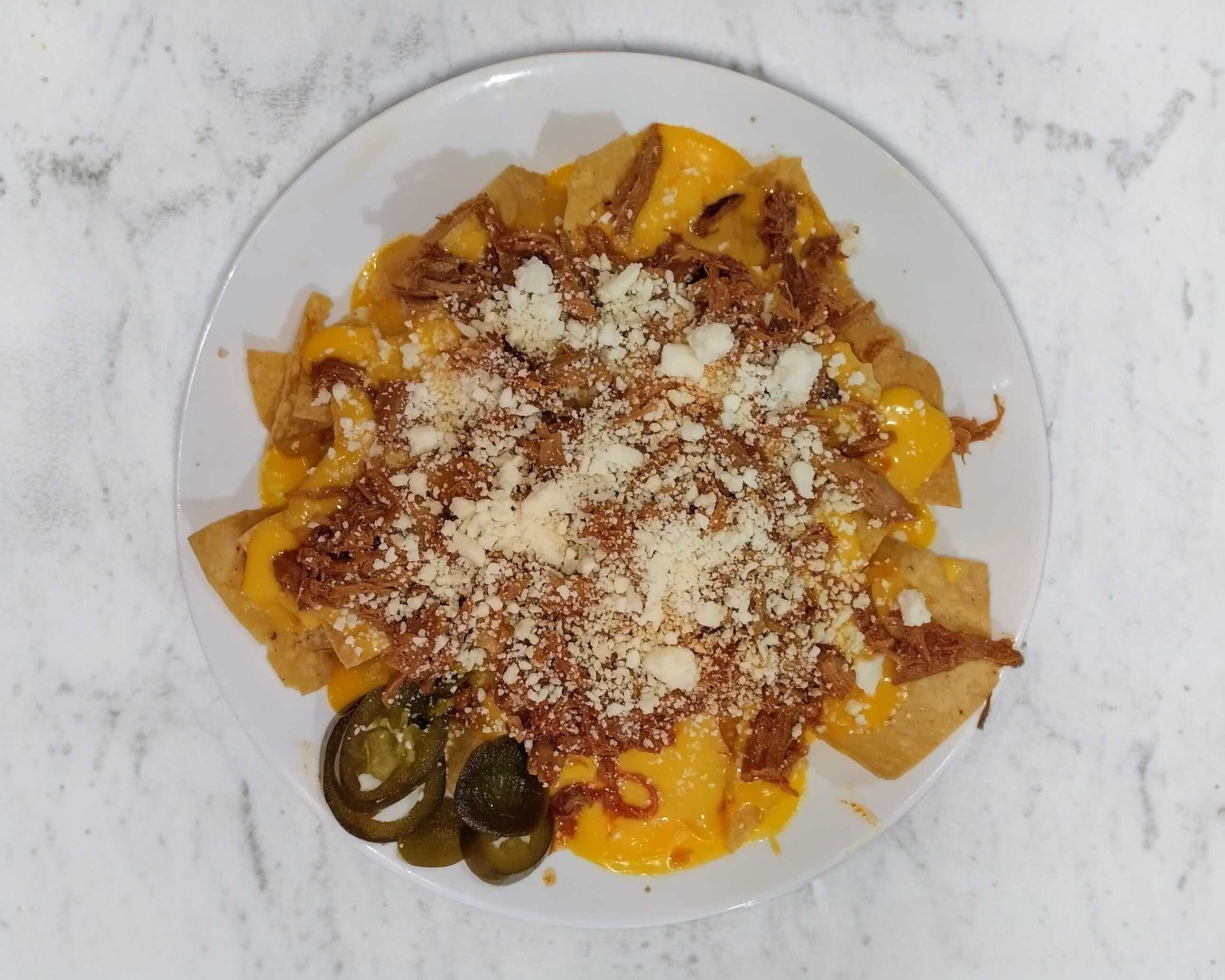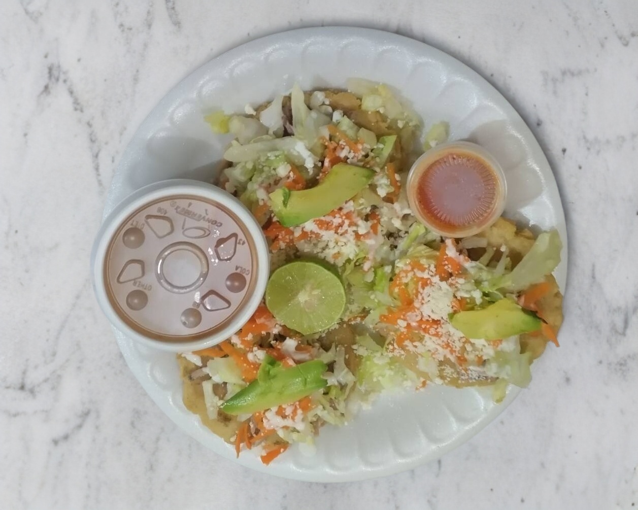 Tostada con frijol, carne deshebrada de res, lechuga, zanahoria, aguacate, quesito molido y media crema.