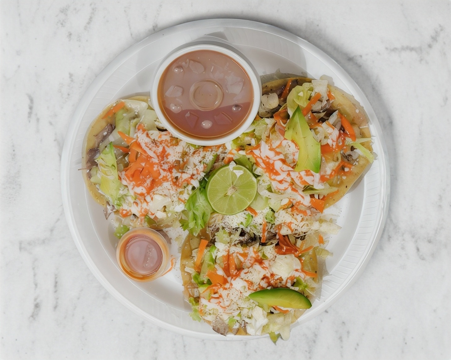 Gordita con frijol, carne deshebrada res, lechuga, zanahoria, aguacate,quesito y media crema.
