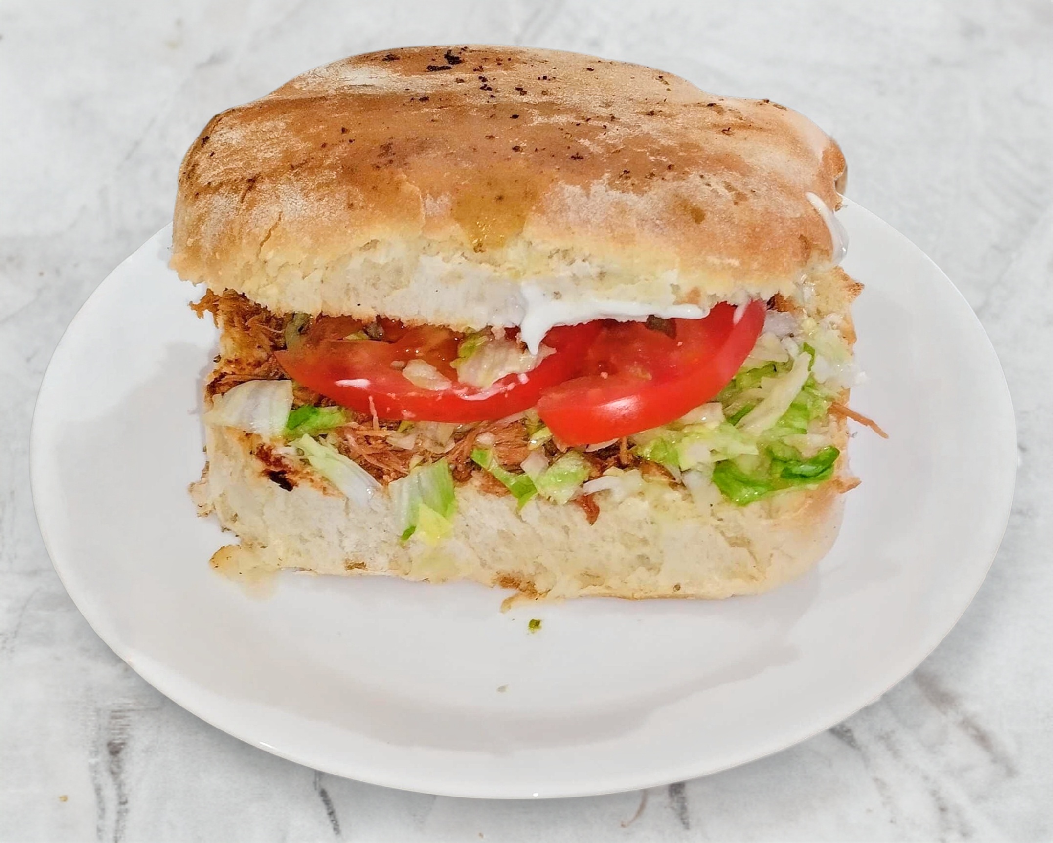 Pan telera, carne de pierna, lechuga, tomate, cebolla y aguacate.