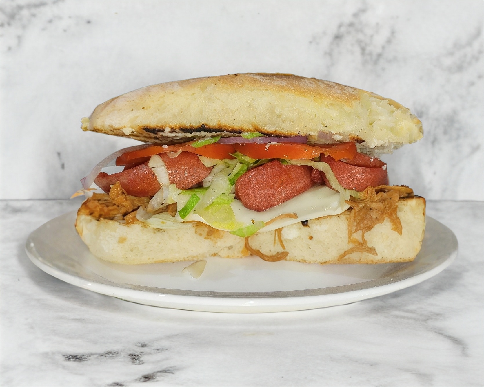 Torta de pierna con jamon, queso, salchicha y verdura acompañada de chiles