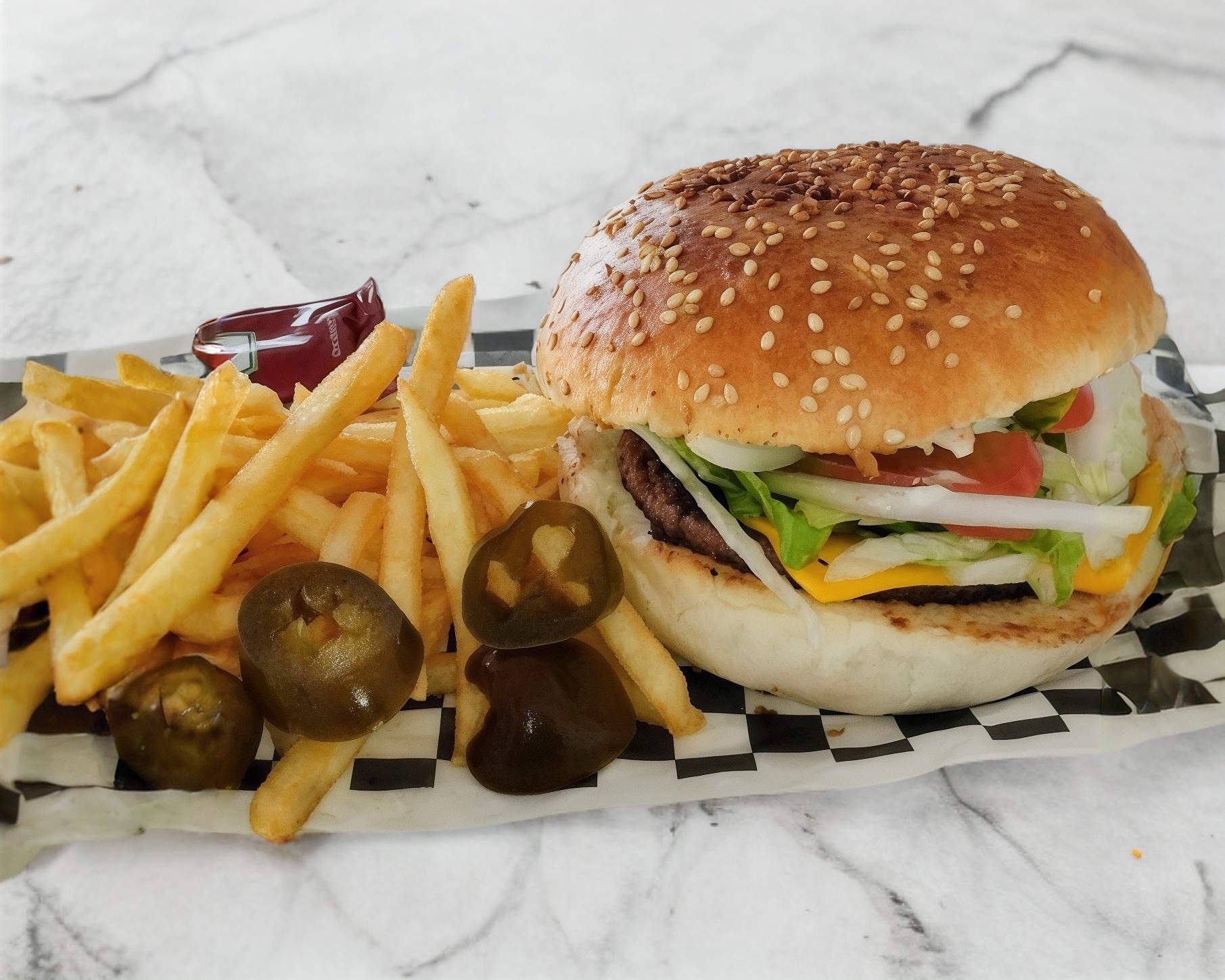 Hamburguesa clasica juanitas con papas, carne de res(80-100gr) con mayonesa, queso americano, lechuga, tomate, cebolla y aguacate. acompañado con 120gr de papas con chiles, catsup ¡un clasico completo!