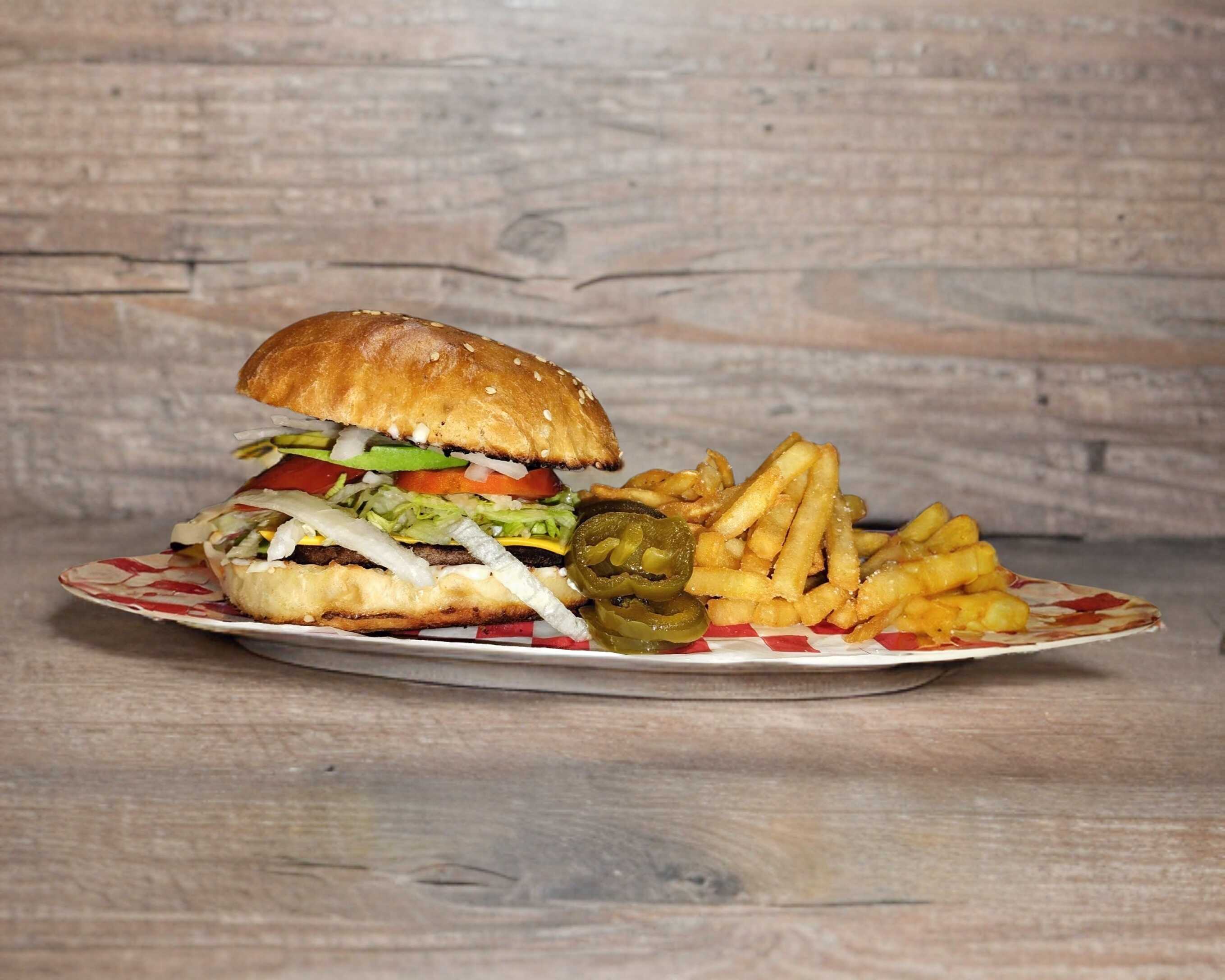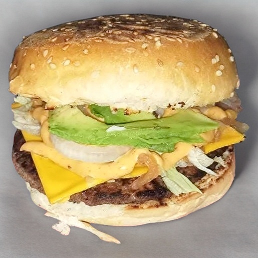 Hamburguesa Clásica: Carne de res (80-100 g) con mayonesa, queso americano, lechuga, tomate, aguacate y cebolla en pan tradicional. Acompañada de 120 g de papas a la francesa, chiles jalapeños y catsup. ¡Un clásico delicioso y completo!