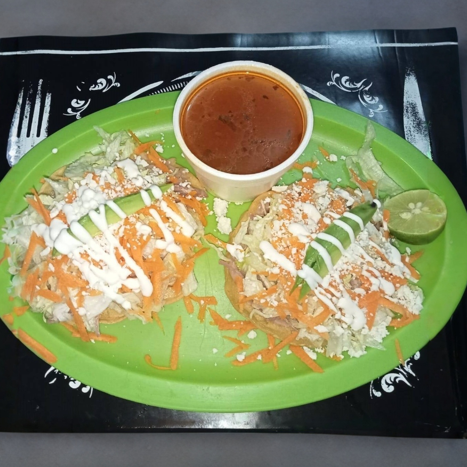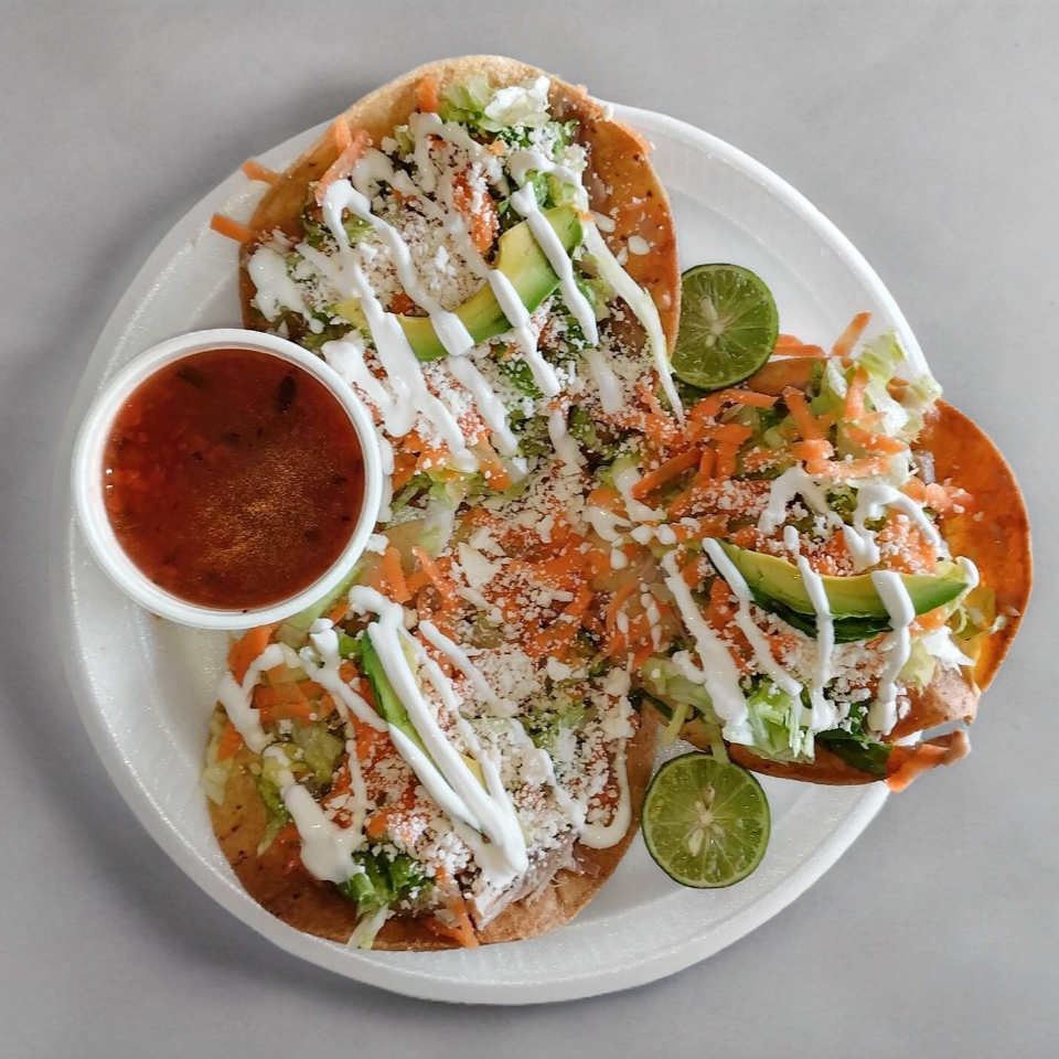 3 Tostadas con frijol, carne deshebrada de res, lechuga, zanahoria, aguacate, queso rallado y media crema. Lleva jugo/bichi, salsa y limon. por separado.