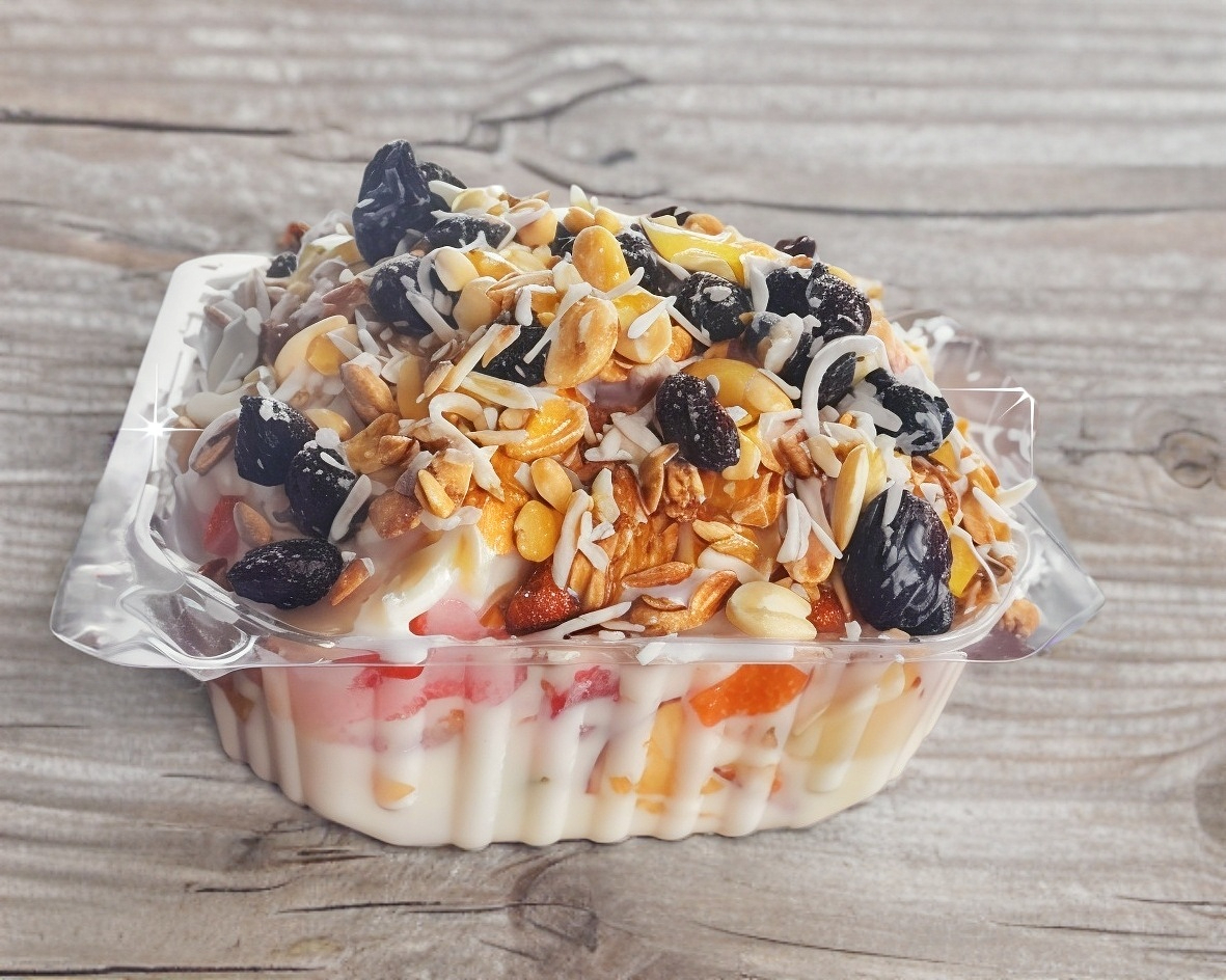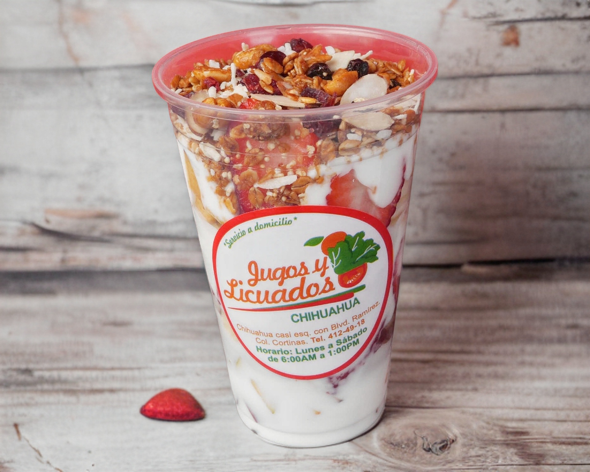 Vaso 1/2, yogurt ligth, manzana verde, manzana roja, plátano, papaya, melón, fresa, granola, coco rallado, pasitas, cacahuate.