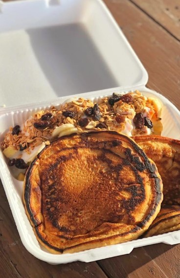Dos piezas de hot cakes, una porción de fruta con yogurt y granola