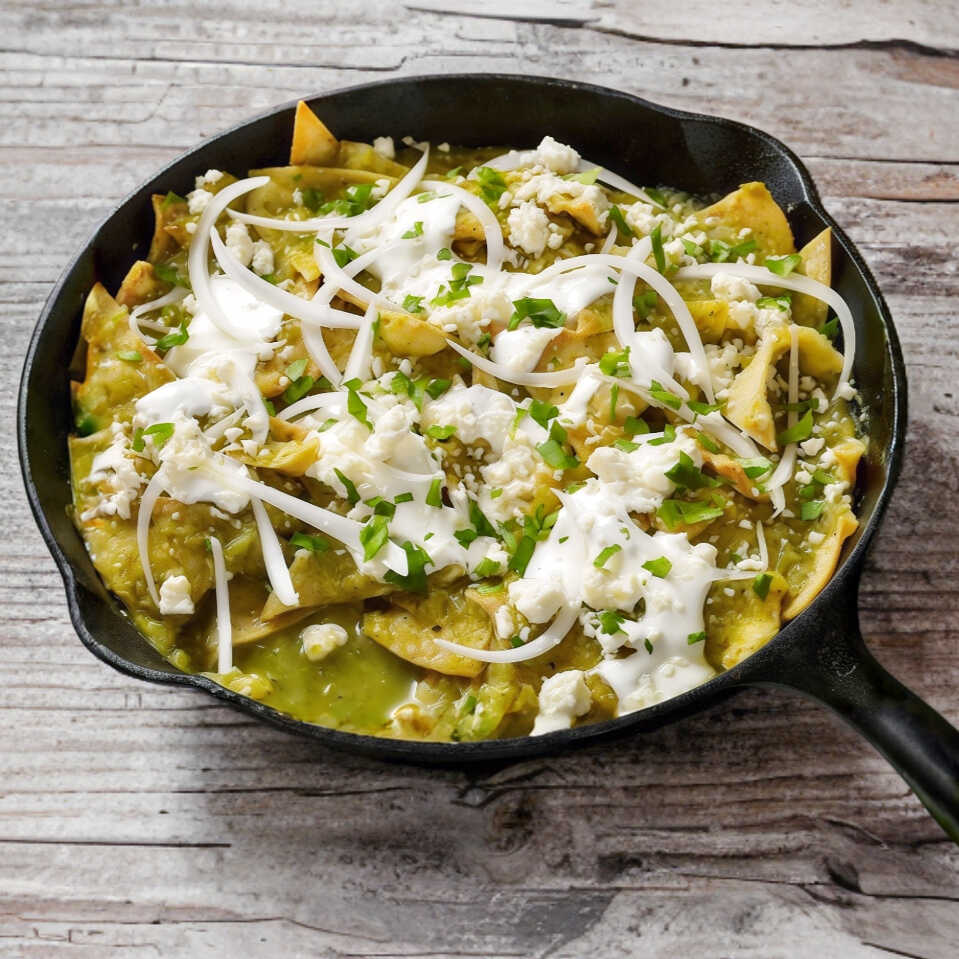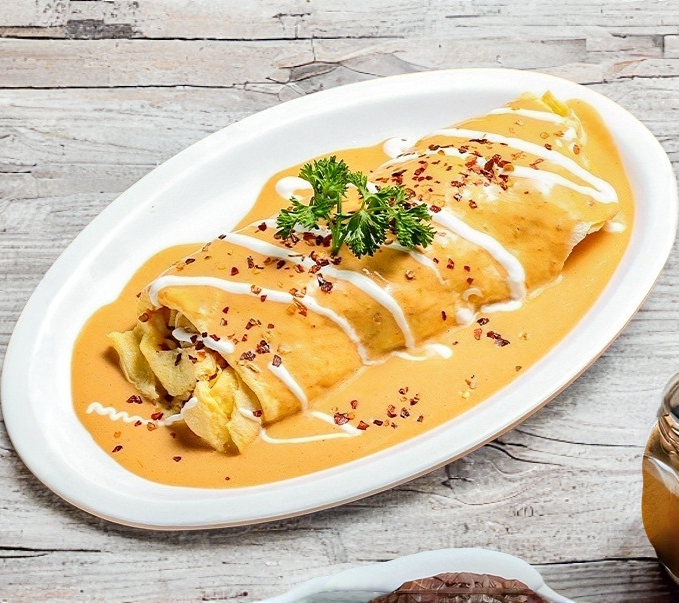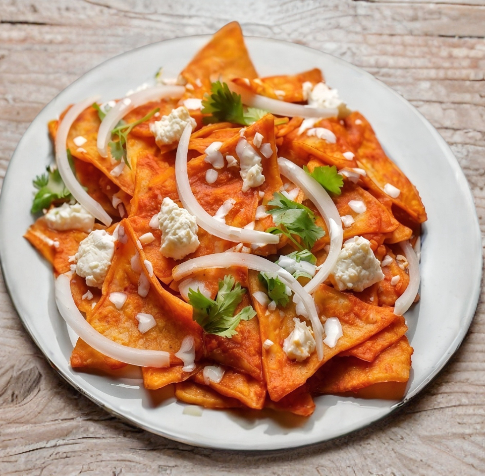 Fritura de maíz, cebolla morada, cilantro, queso oreado y bañado en salsa.