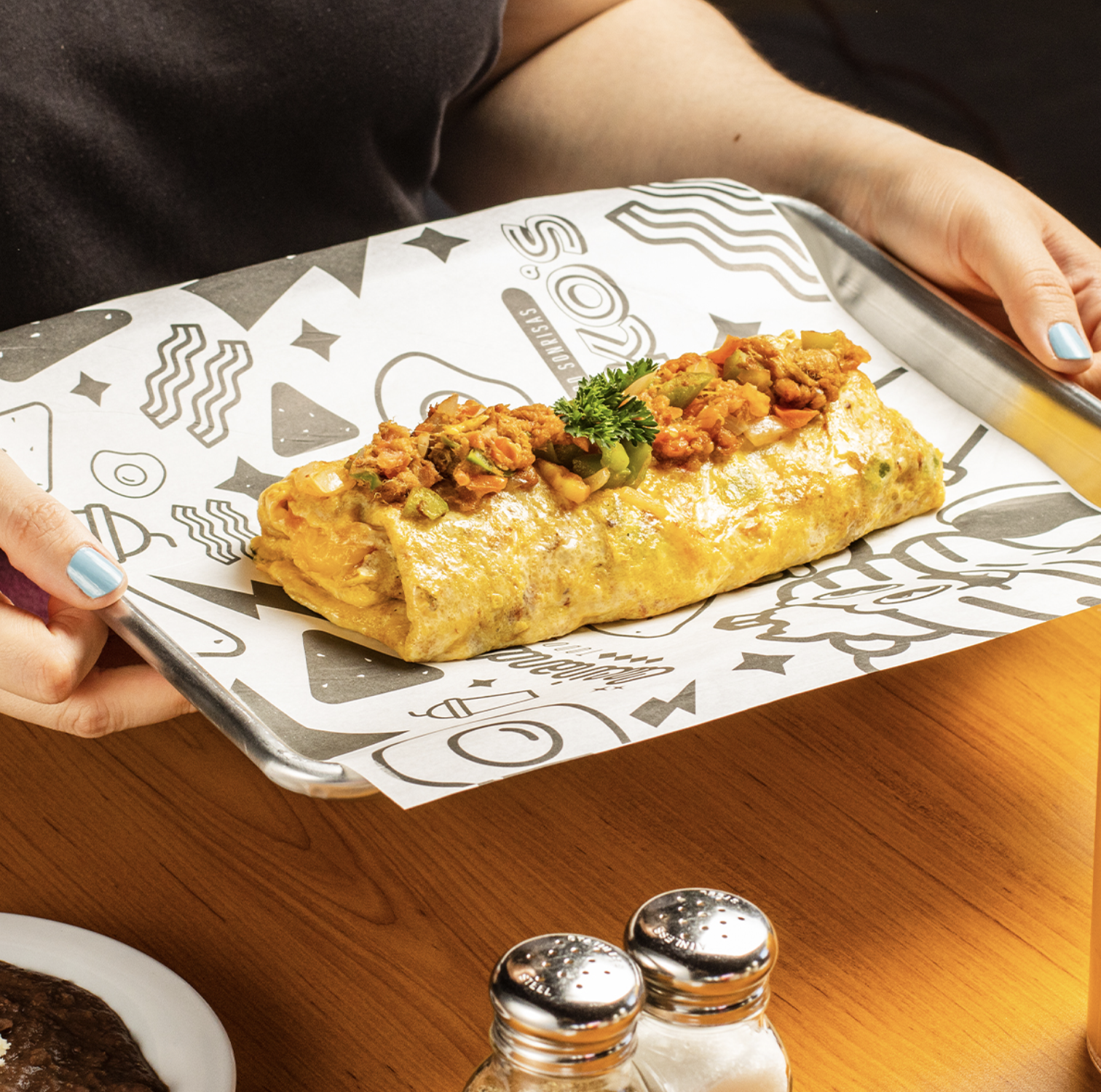 Costra de queso, huevo revuelto, espinaca, champiñones y cebolla morada.