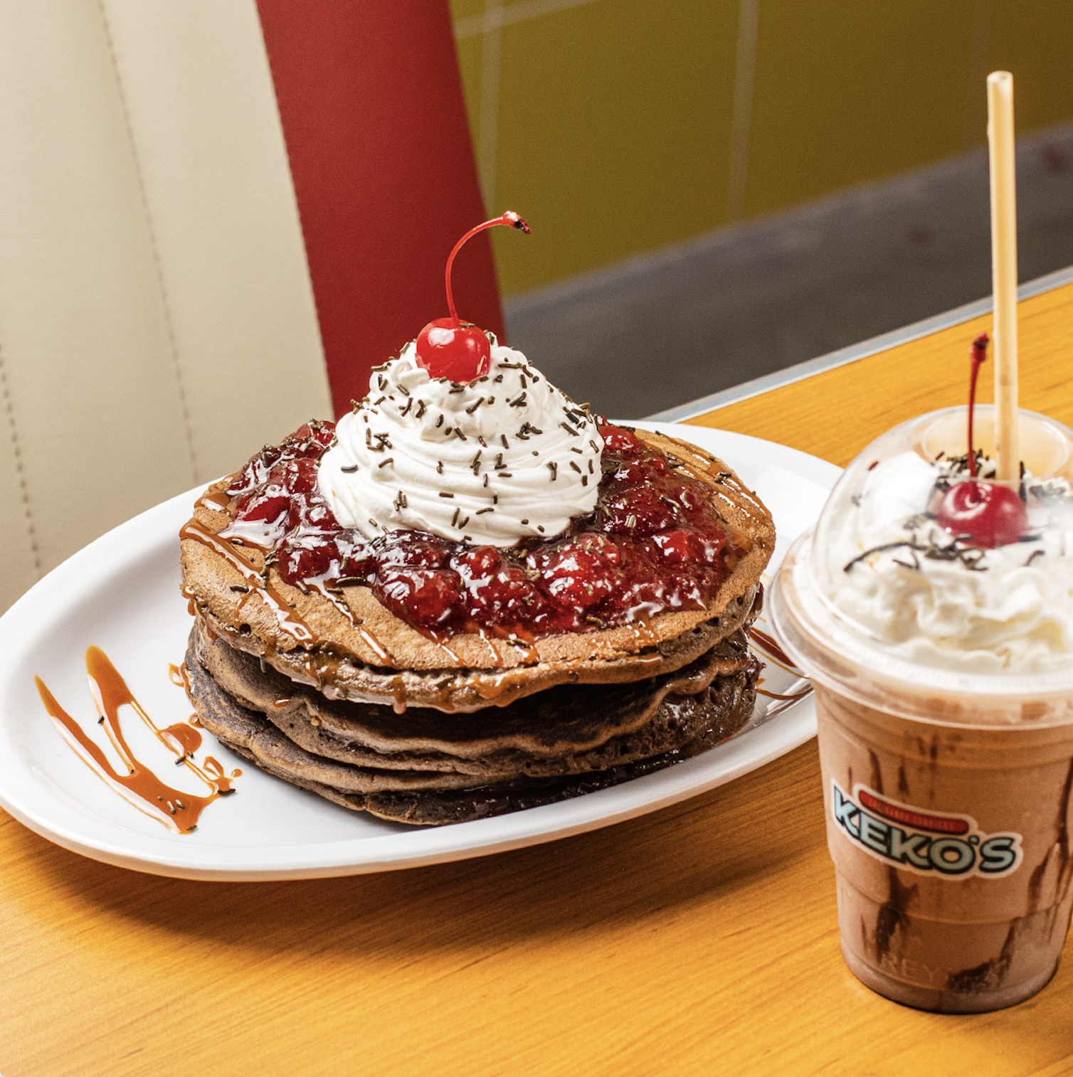 3 Piezas de hot cakes de chocolate, crema batida, mermelada de fresa, chispas de chocolate y cajeta.