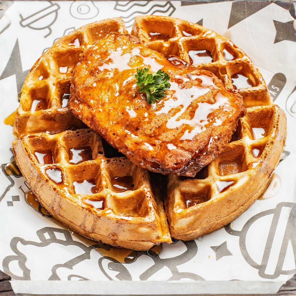 1 Pieza de waffle con miel de chiltepín acompañado de una pechuga de pollo empanizada.