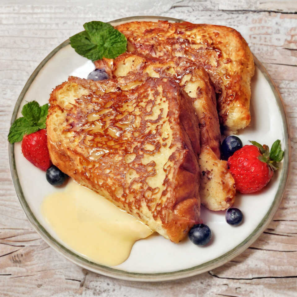 3 Piezas de hot cakes tradicionales, mantequilla, plátano, fresa.