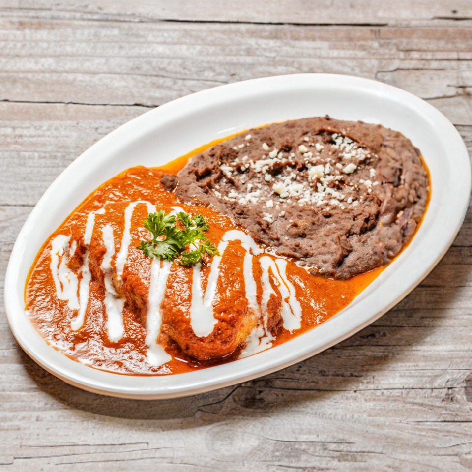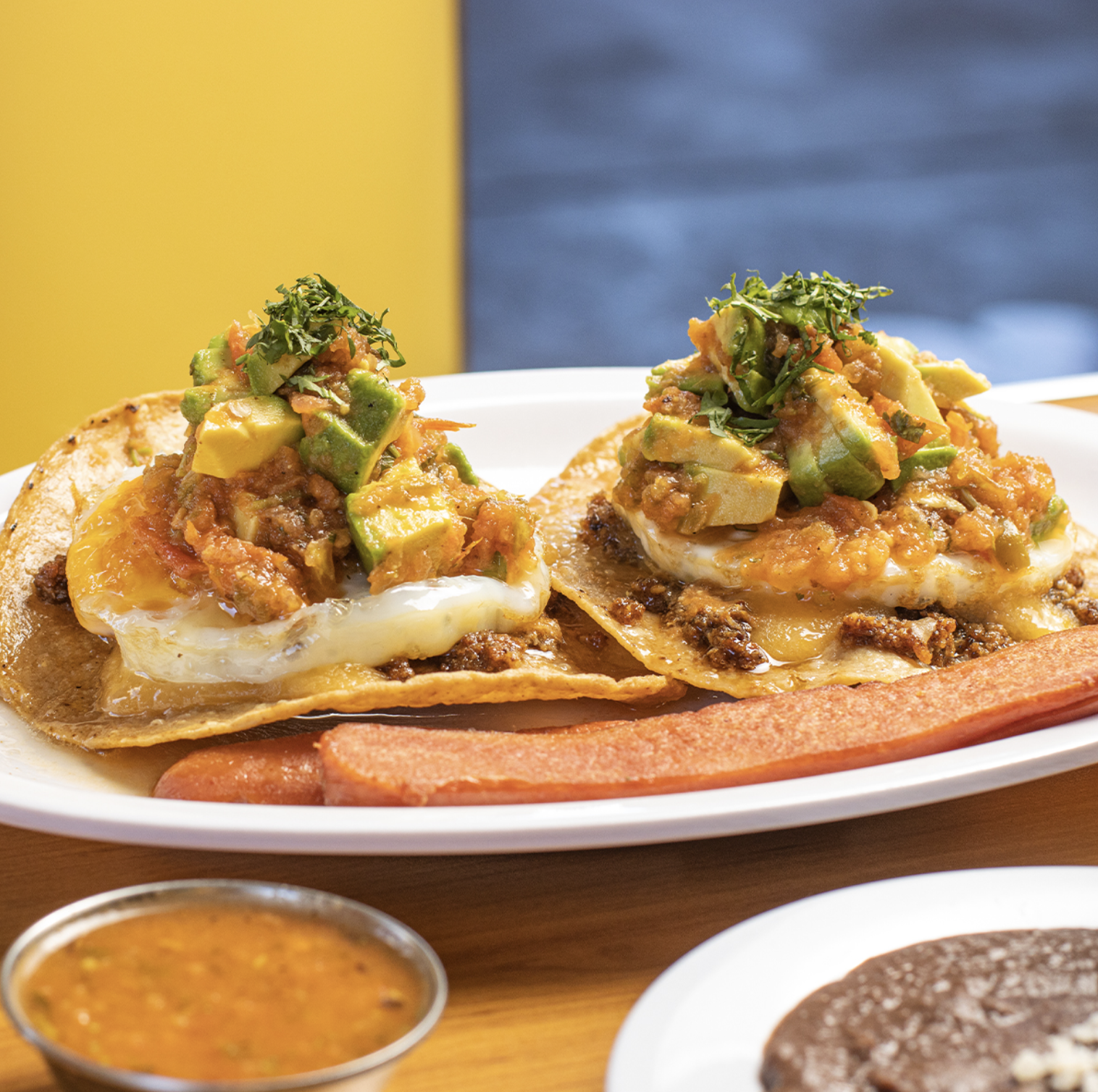 Acompañados de frijoles. Salsa, totopos, cilantro, cebolla, crema y queso fresco rallado.