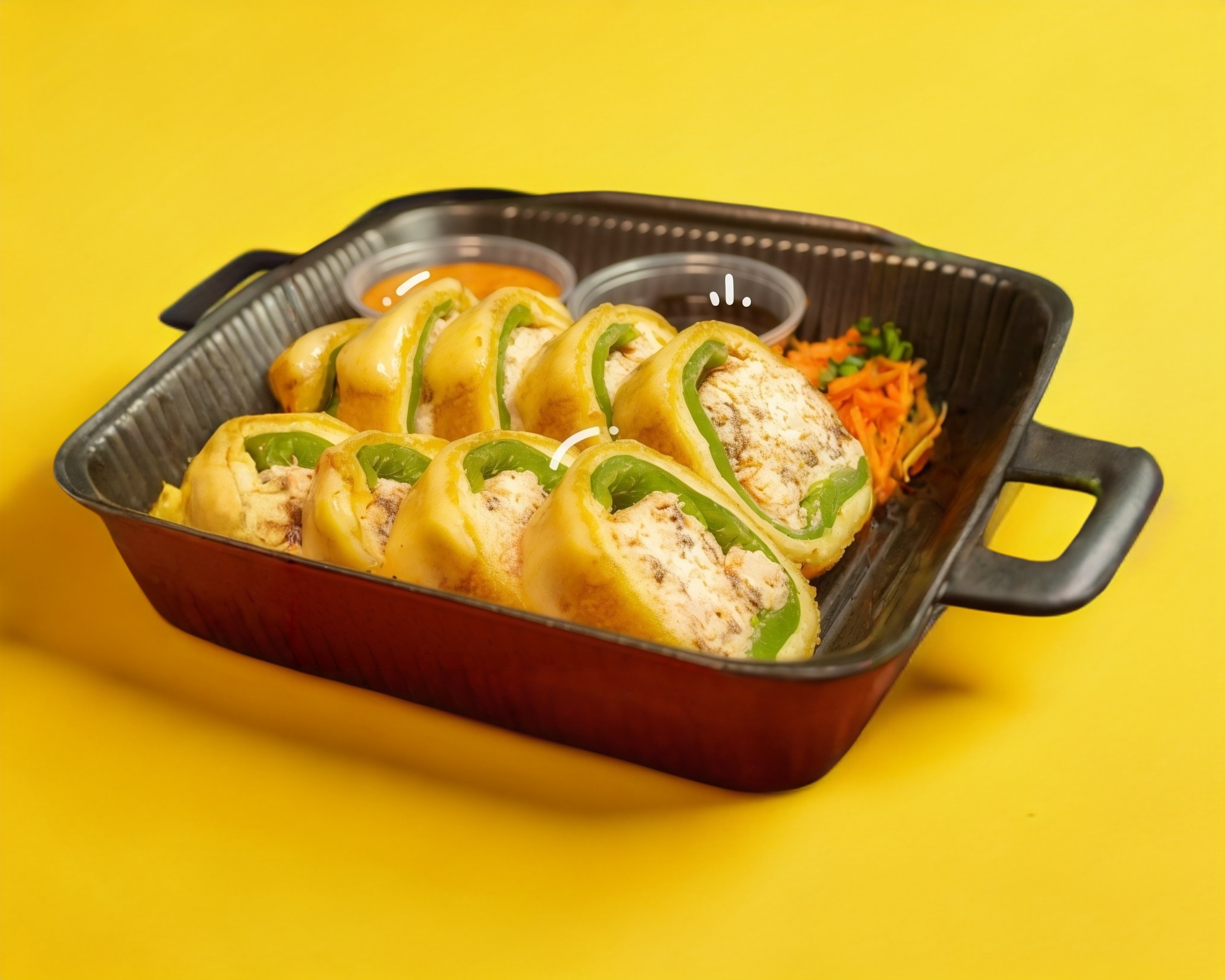 Chile verde, relleno de mezcla de arroz, phila, tampico, res y pollo.