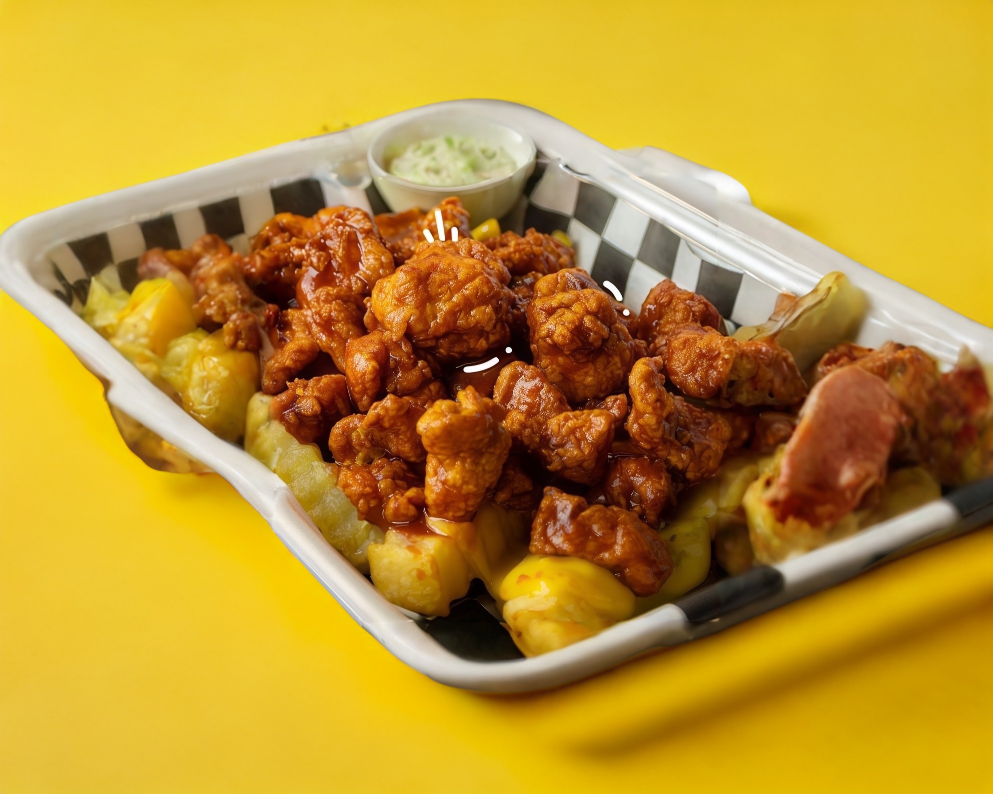Papas fritas con queso y boneless bañados con salsa búfalo o BBQ.