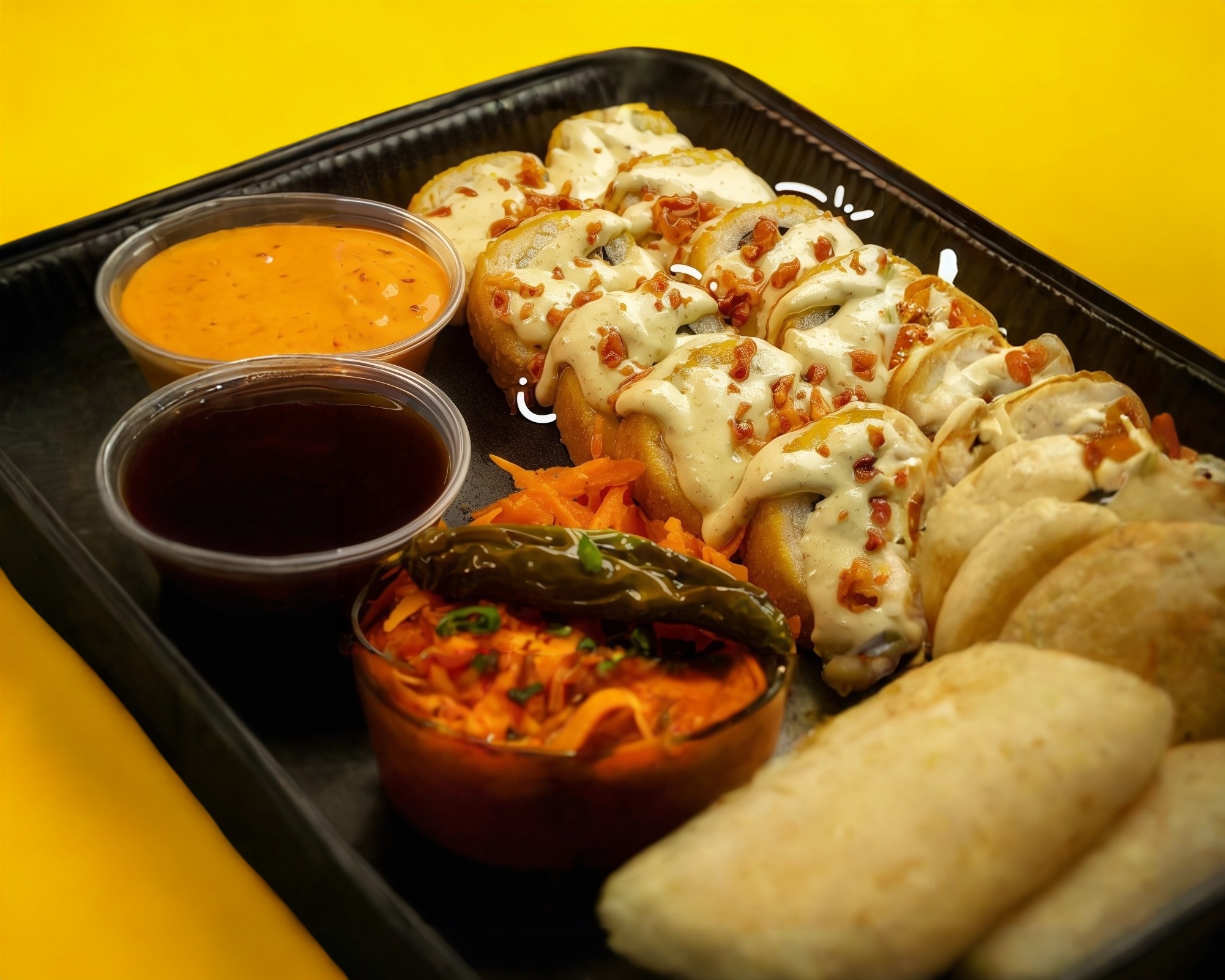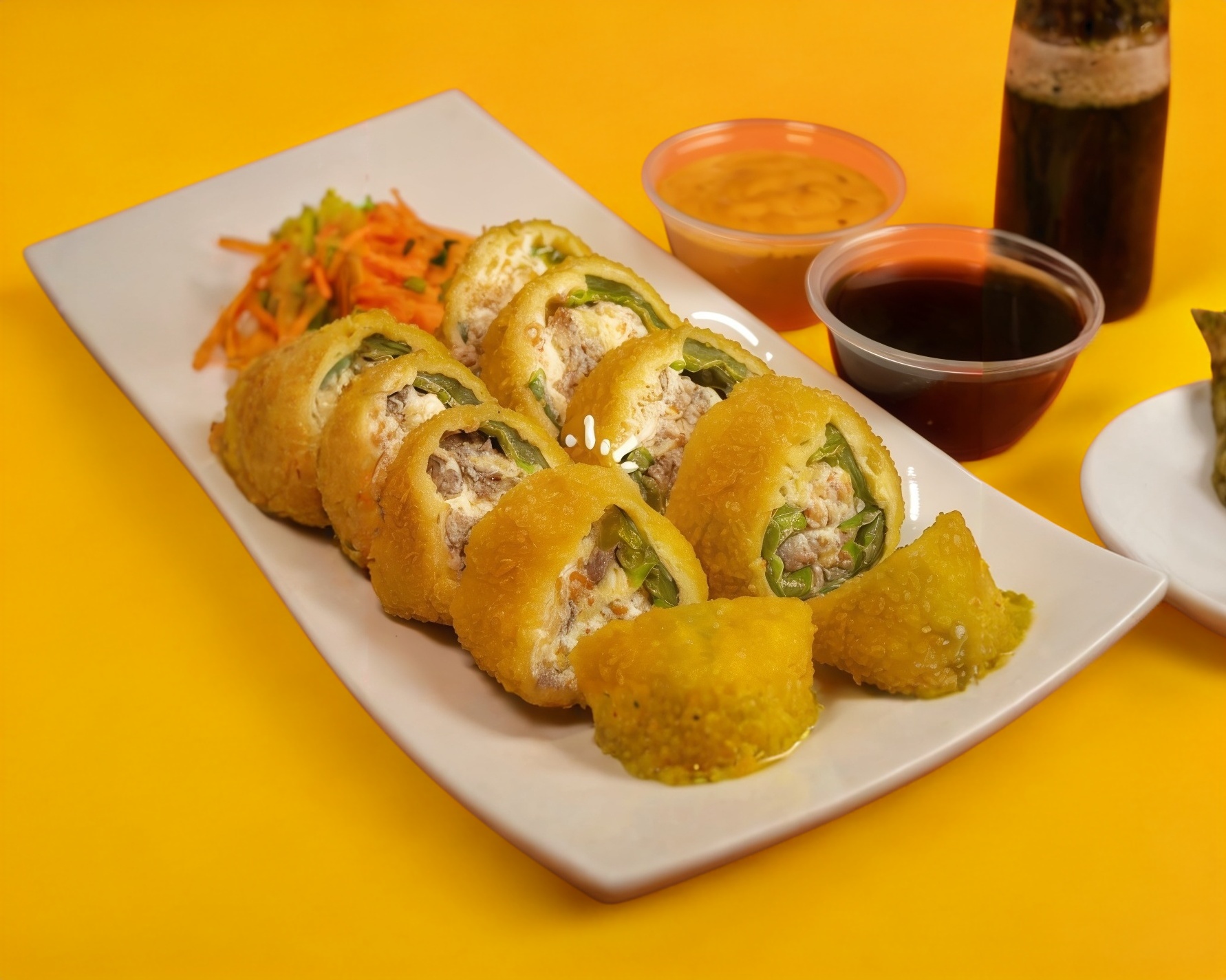 Rollo California (aprox. 200 gramos de arroz) Proteína a elección: pollo, carne, camarón, tocino, surimi o tampico. Acompañado con salsa de soya y aderezo chipotle, con queso Philadelphia, aguacate y pepino por dentro.