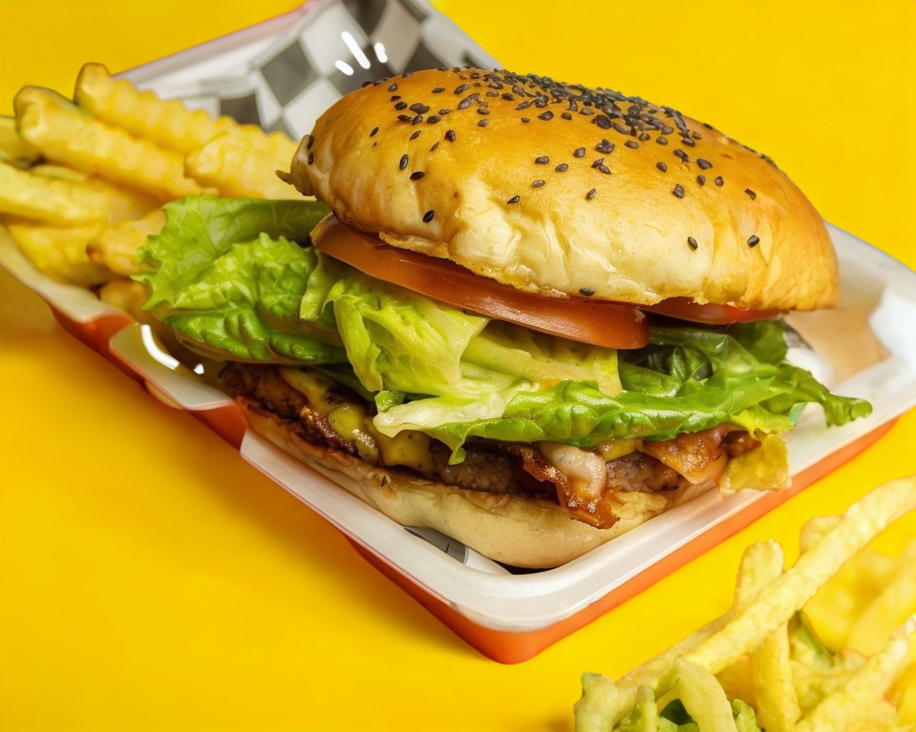 Carne sirloin, queso, lechuga, tomate y cebolla.