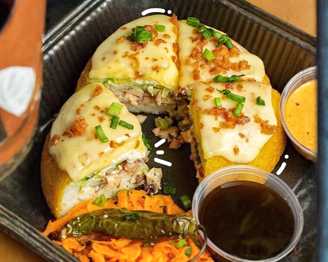 Carne empanizada y coronado con surimi spicy.