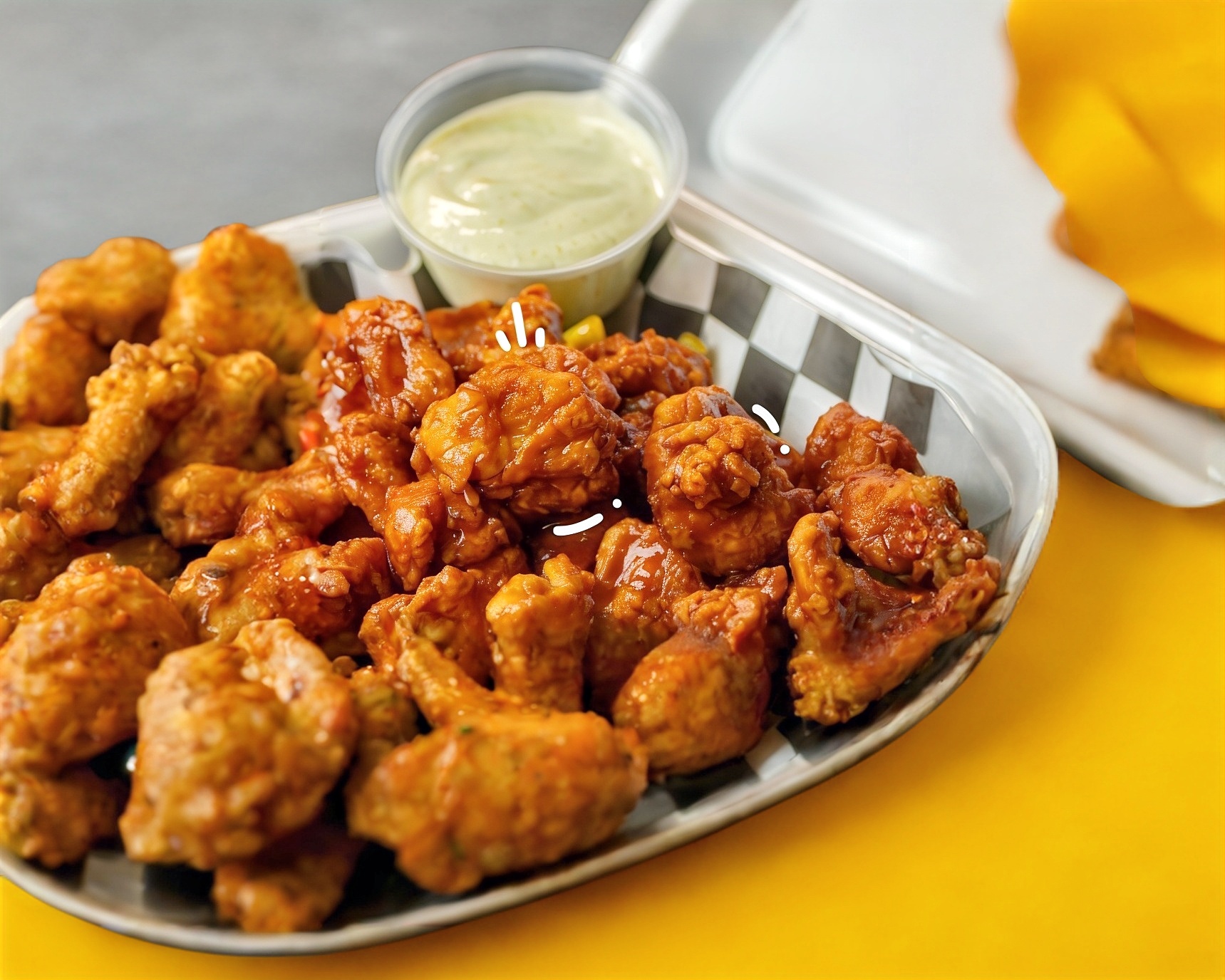 Tiras de pechuga de pollo capeadas bañadas con salsa búfalo o BBQ.