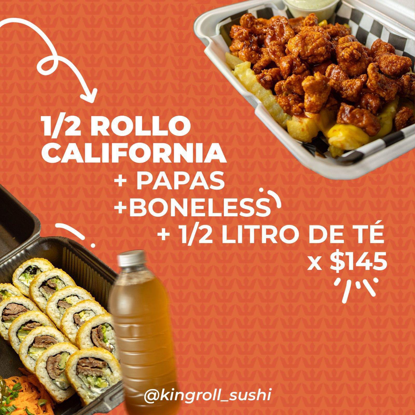 Medio Rollo California, mas papas, mas boneless, mas medio litro de té