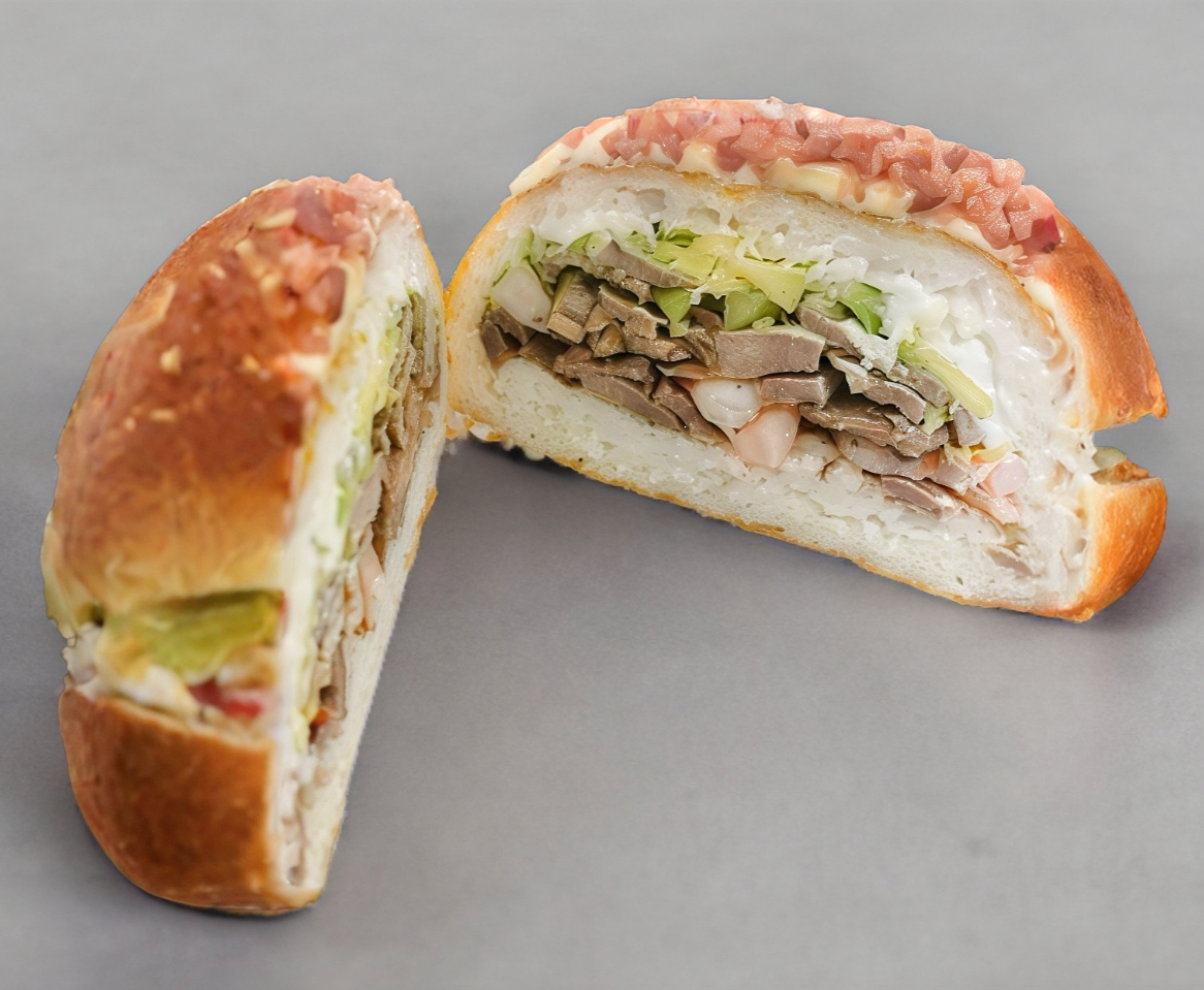 Res, pollo, chile tatemado, cebollin, Philadelphia, pepino y aguacate. Por fuera queso gratinado y tocino.