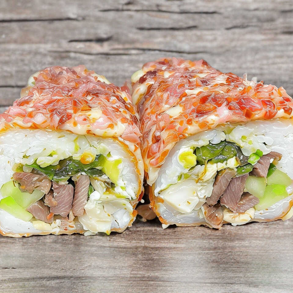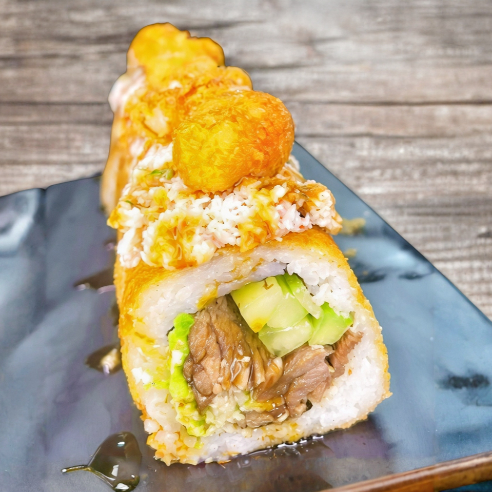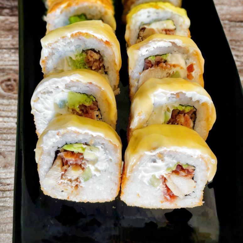 California roll, pero en una versión más grande y con un toque especial. La combinación de las dos proteínas que elijas, junto con el queso Philadelphia, aguacate y pepinon y por fuera queso gratinado y tocino.