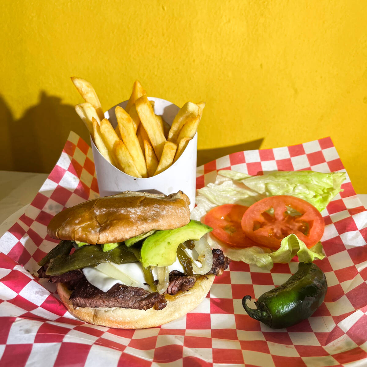 Frijolito, chilito y puro poder mexicano. Carne 150 g, BBQ de la Barda, queso blanco, enjarre de frijol, chile verde, cebolla, tomate, lechuga, incluye papas