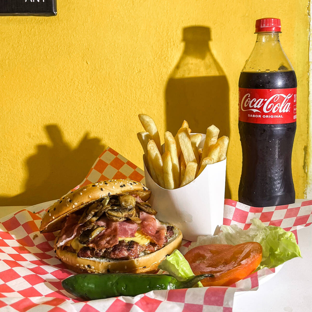 Con tanto sabor que hasta el chalán quiere una. Carne 150 g, BBQ de la Barda, queso amarillo, champiñones, tocino, cebolla, tomate, lechuga, incluye papas